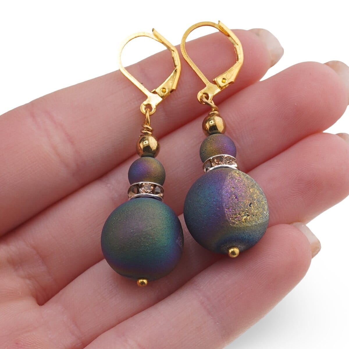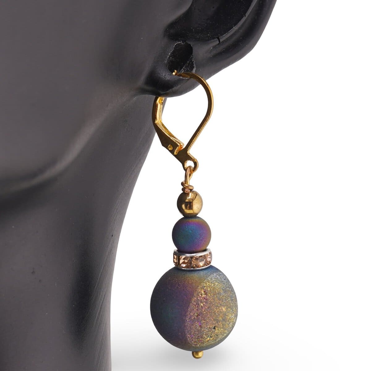 Cerceii cu agățătoare din Cuart Titan Aura în forme de sfere îmbină strălucirea metalului auriu cu jocul de culori al cristalelor tratate, pentru un accesoriu modern și ușor de purtat zi de zi. Fiecare sferă, cu dimensiuni cuprinse între aproximativ 6 și 15 mm, creează un efect vizual interesant, astfel încât cerceii să se remarce discret, fără să fie încărcați.