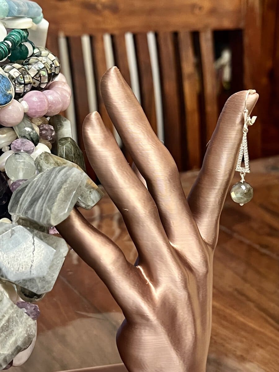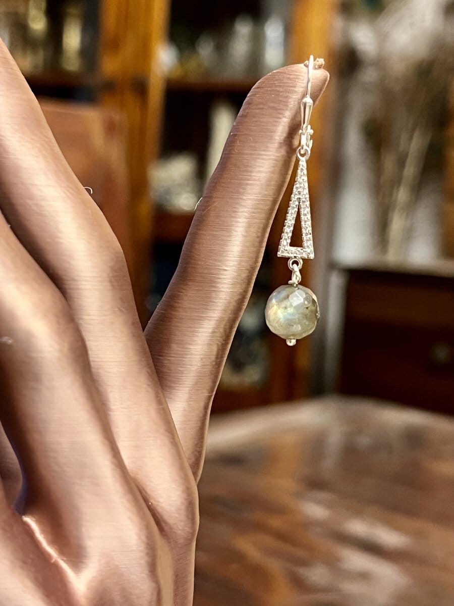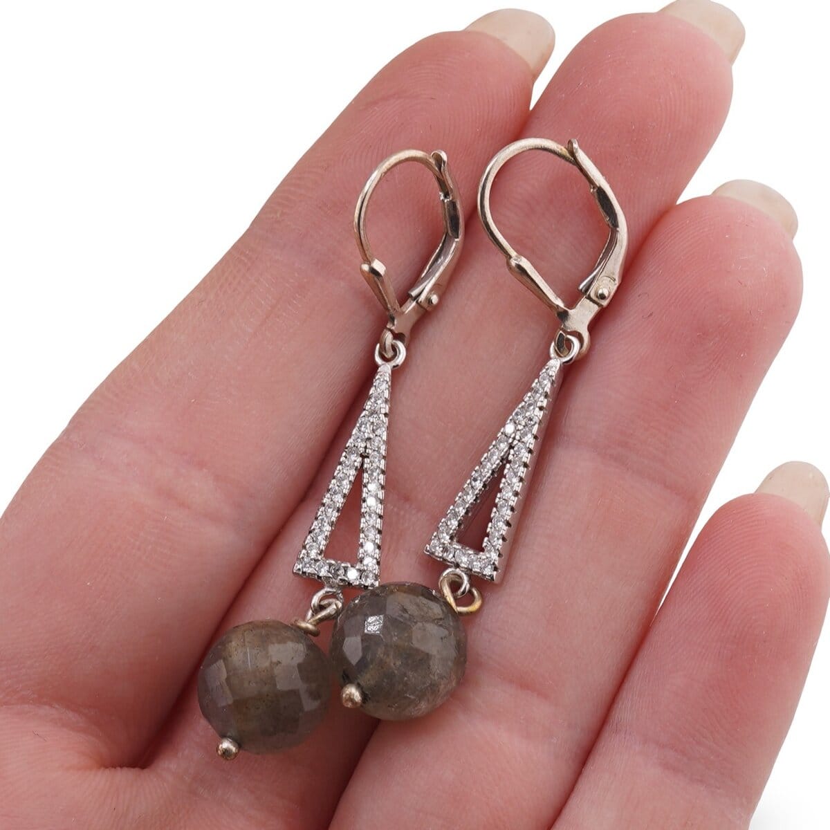 Cerceii cu agățătoare din labradorit cu sfere fațetate de 10 mm, montați în argint 925, sunt o alegere inspirată dacă îți dorești o bijuterie discretă, cu tonuri de gri, care să îmbine eleganța cu susținerea emoțională și spirituală. Strălucirea delicată a fațetelor pune în valoare reflexiile specifice labradoritului și îți aduce aproape energia unei pietre cunoscute ca sprijin pentru echilibru interior.