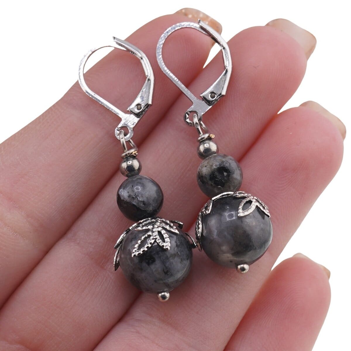 Cercei cu agatatoare Larvikit sfere si flori argintii, 6-10mm