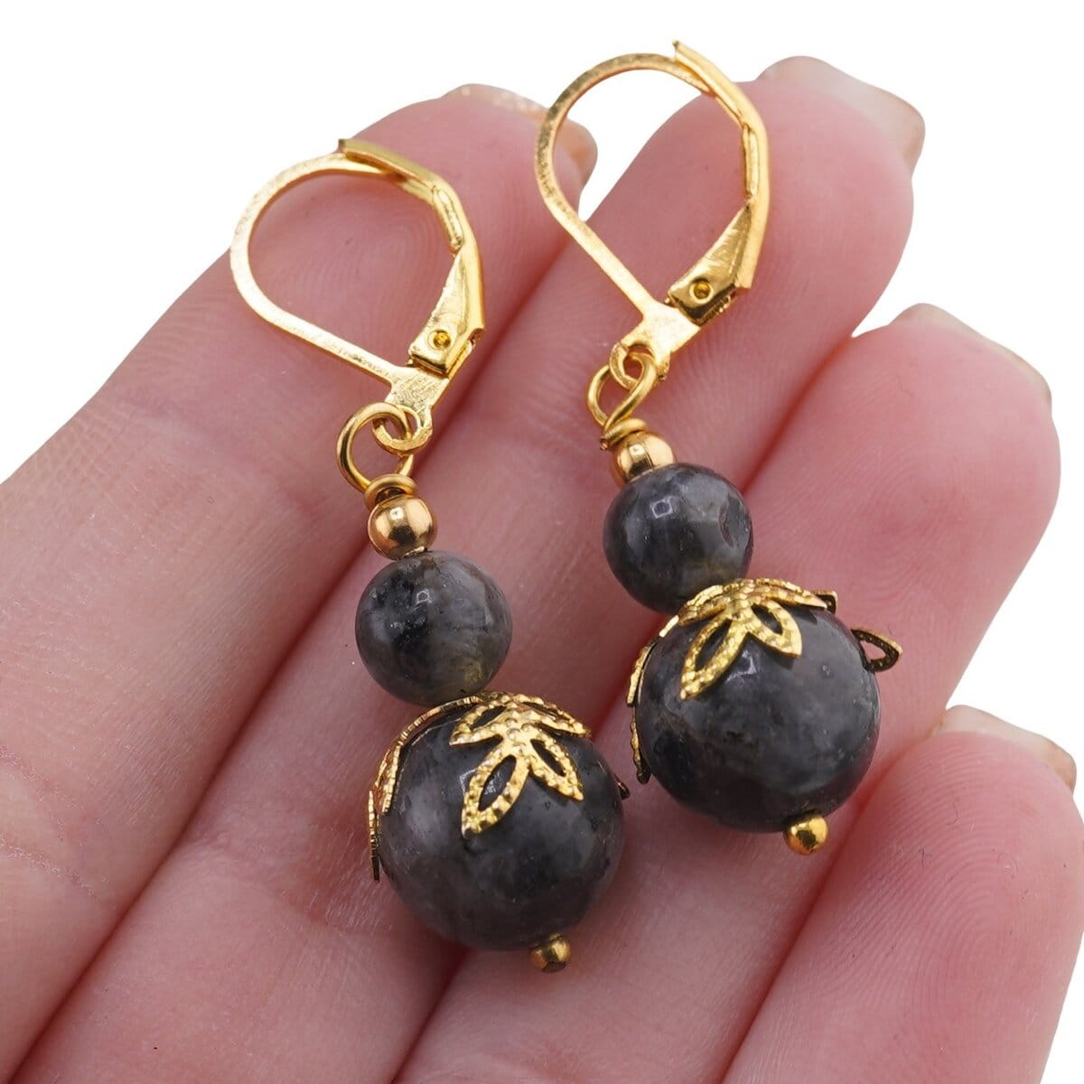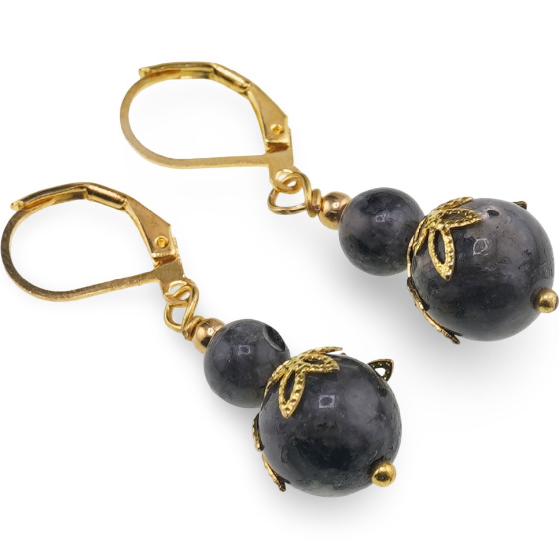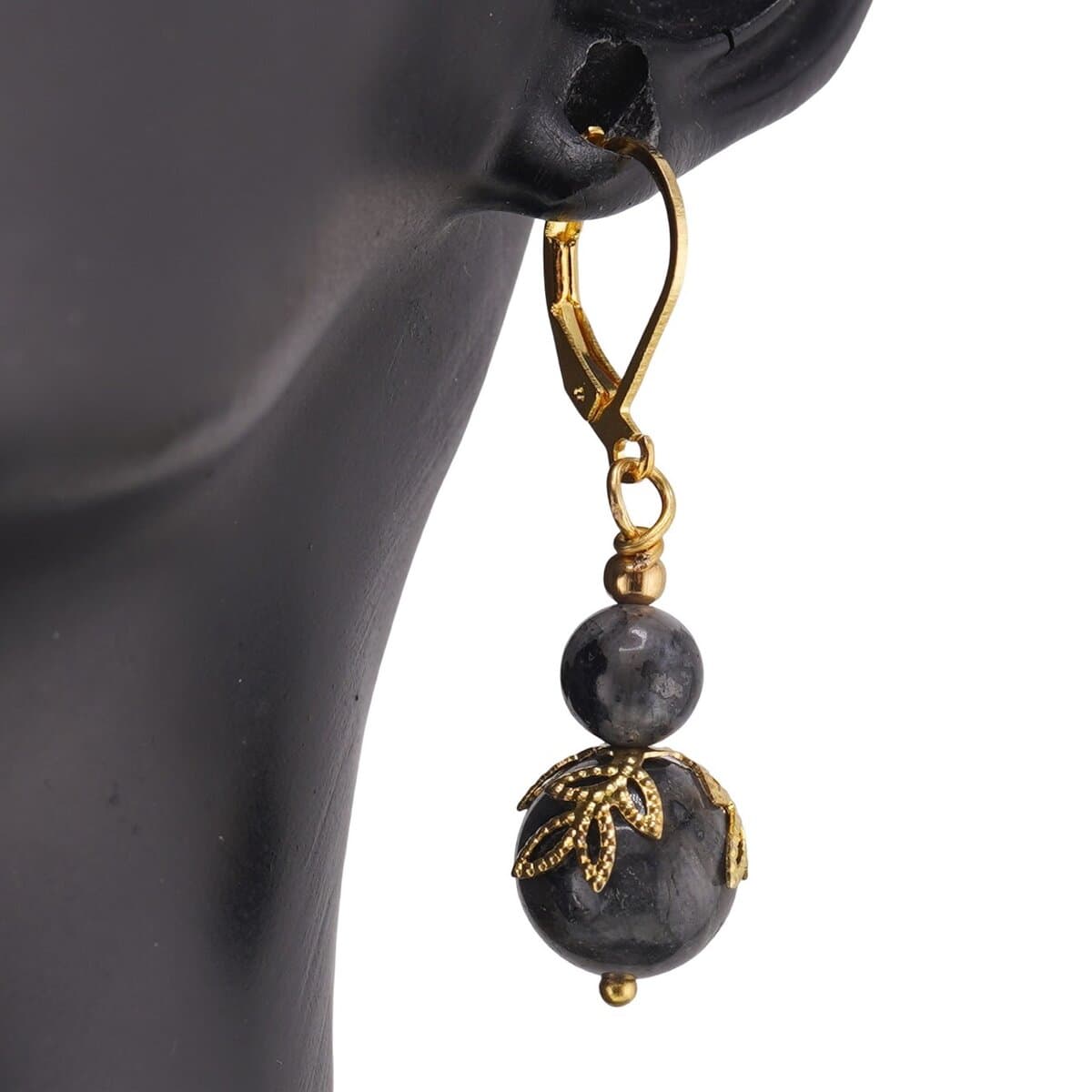 Cercei cu agatatoare Larvikit sfere si flori aurii, 6-10mm