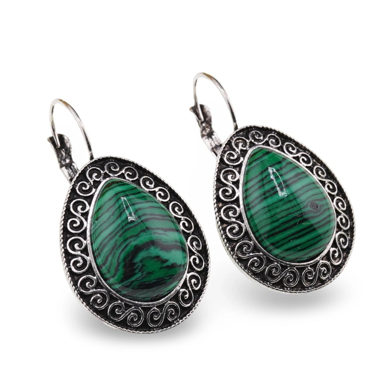 Cercei cu agatatoare Malachit in montura argintie - model lacrima cu gravura, 27mm.