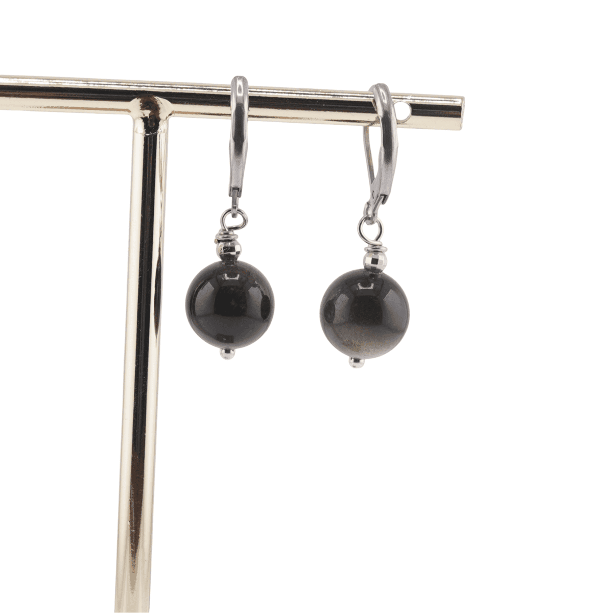 Cercei cu agatatoare obsidian auriu, sfera de 10mm si bumb gravat.