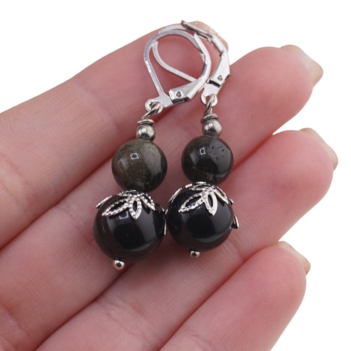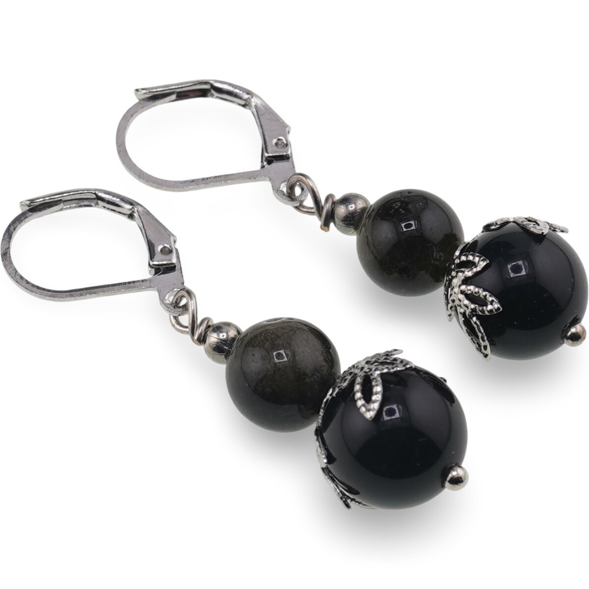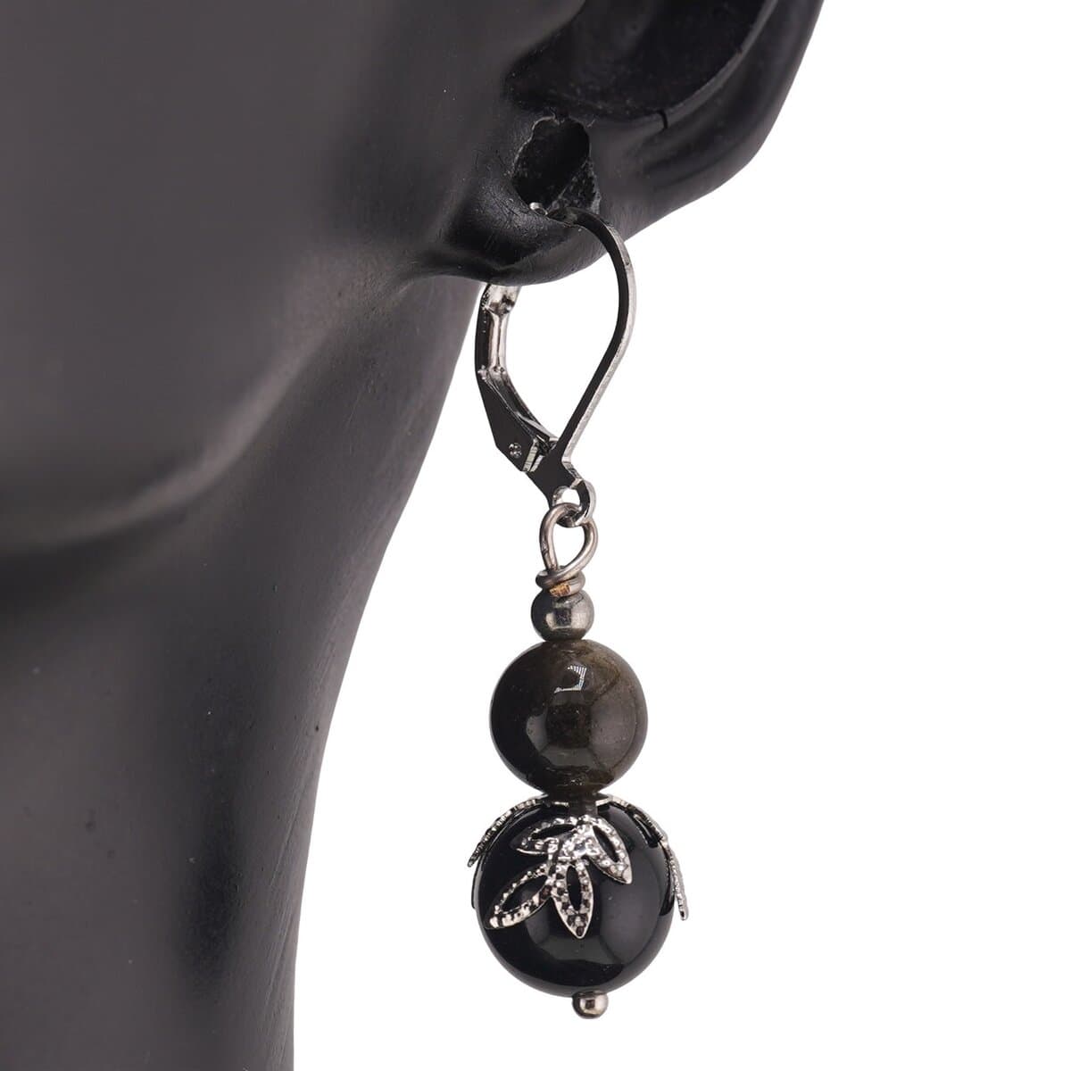 Cercei cu agățatoare Obsidian auriu sfere și flori argintii, 8-10mm