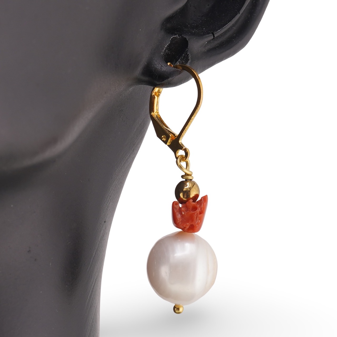 Cerceii cu agatatoare din perle de cultura albe si coral rosu aduc impreuna energia blanda a apei si vitalitatea focului interior. Perlele de cultura, cu forme usor neuniforme si diametre intre aproximativ 10 si 15 mm, se imbina natural cu micile sfere neregulate de coral rosu, de 5–7 mm, creand un contrast placut intre alb, auriu si nuantele calde de rosu.