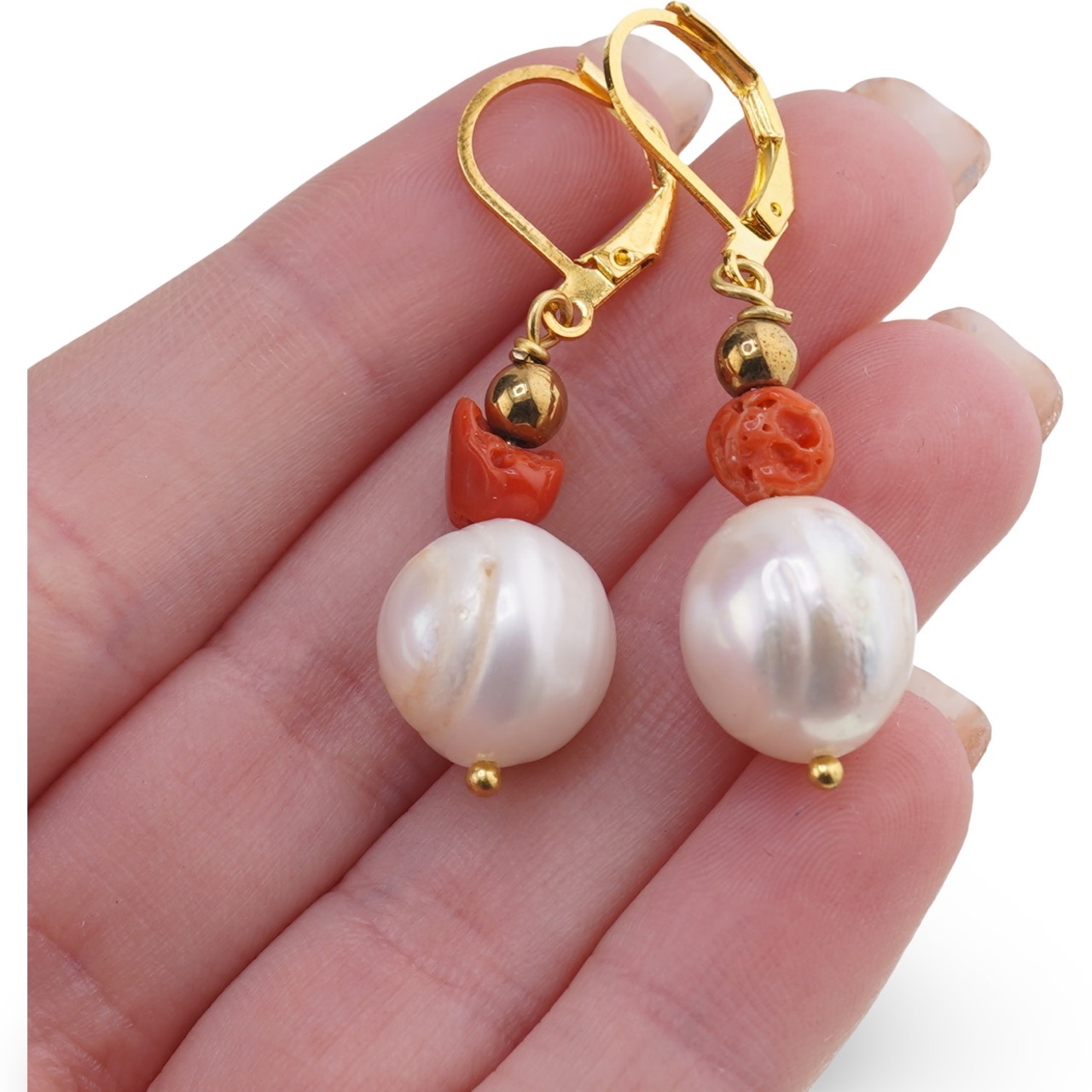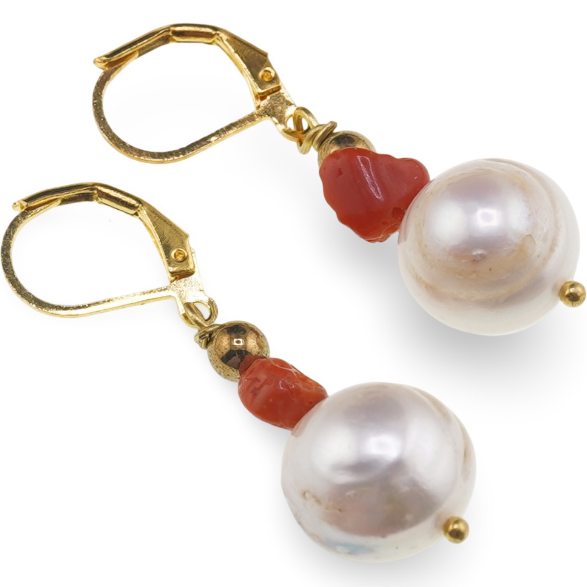 Cercei cu agatatoare Perle de cultura sfere neuniforme 10-15mm si Coral rosu 5-7mm