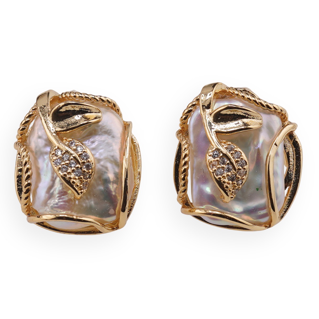 Cercei cu surub Perle de cultura si montura aurie model frunza, 22mm