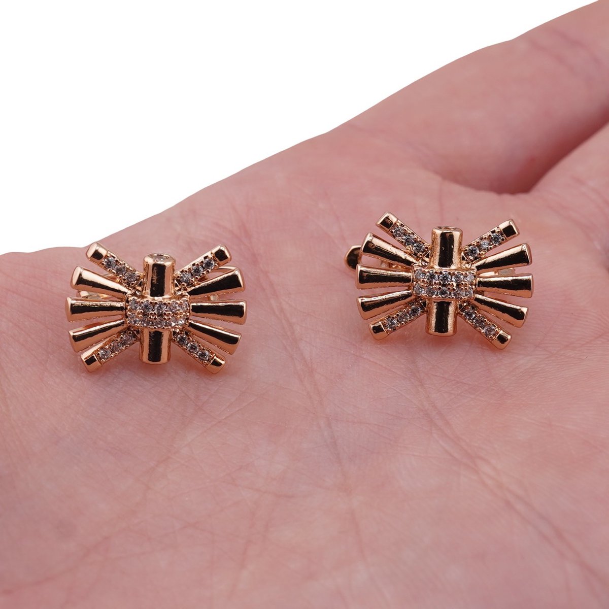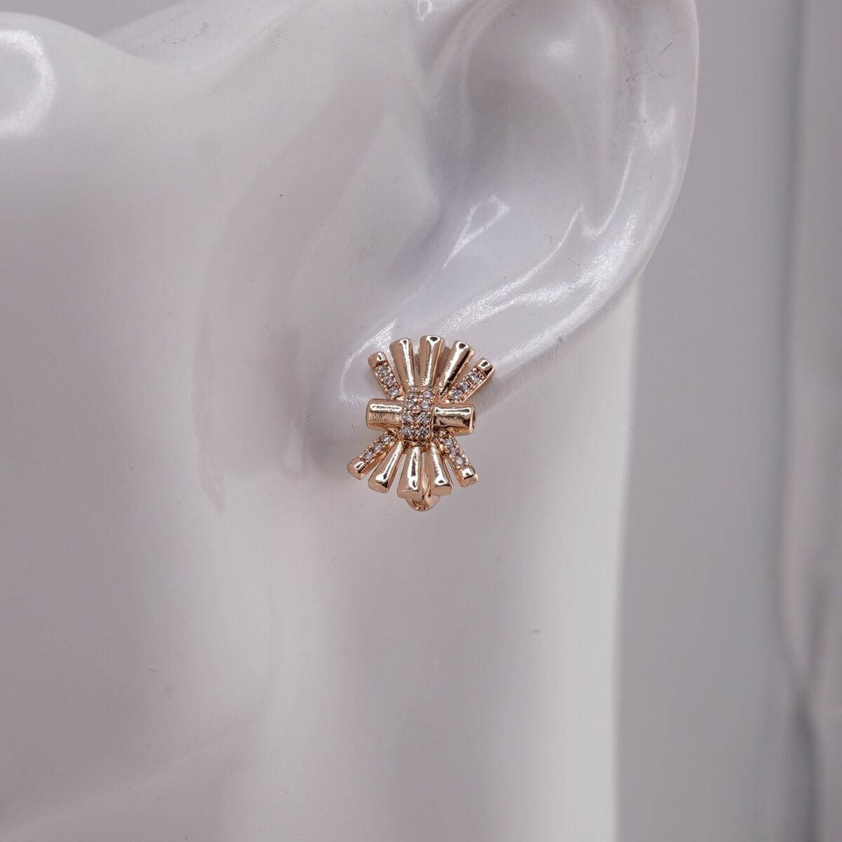 Cerceii din cupru placat cu aur rose 14k, în forma delicată de fundiță cu zirconii strălucitoare, sunt o alegere potrivită pentru tine dacă îți dorești un accesoriu fin, cu o notă romantică și feminină. Nu atrag atenția prin dimensiune, ci prin jocul discret de lumini și prin nuanța caldă de auriu rose, ușor de asortat atât la ținute de zi, cât și la cele de seară.