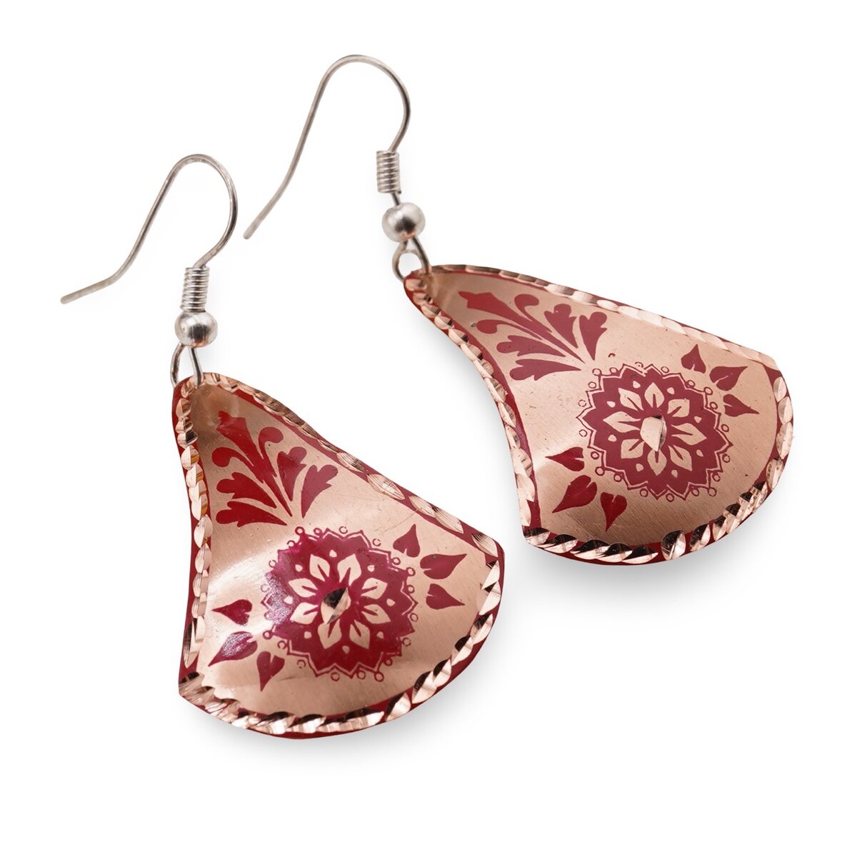 Realizați integral din cupru, cerceii te conectează la un material îndrăgit pentru nuanța sa caldă și pentru semnificațiile sale. Mulți îl apreciază pentru sprijinul adus circulației sângelui, pentru echilibrul energetic și pentru calitățile protectoare, asociate tradițional cu o stare de bine. Accentele roșii din modelul floral dau un contrast elegant și discret, completând grafica mandalei într-un joc armonios de forme și culori.