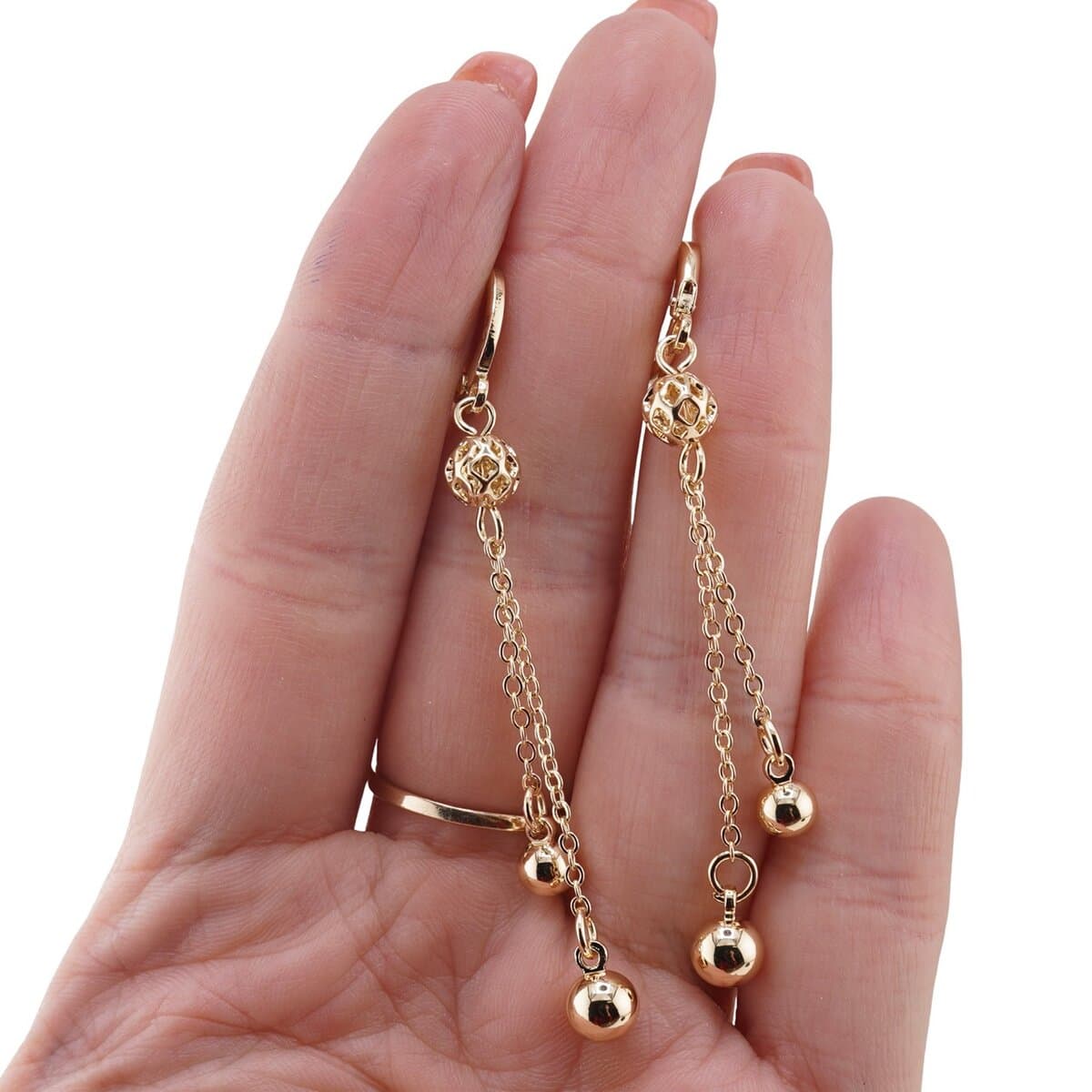 Cercei din cupru placat cu aur galben 18k, model cu doua lanturi si sfere