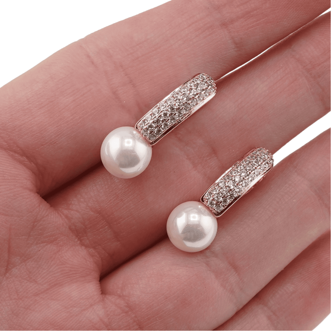 Cercei din cupru placat cu aur roz 18k cu perla si trei randuri de zirconii, 21mm.