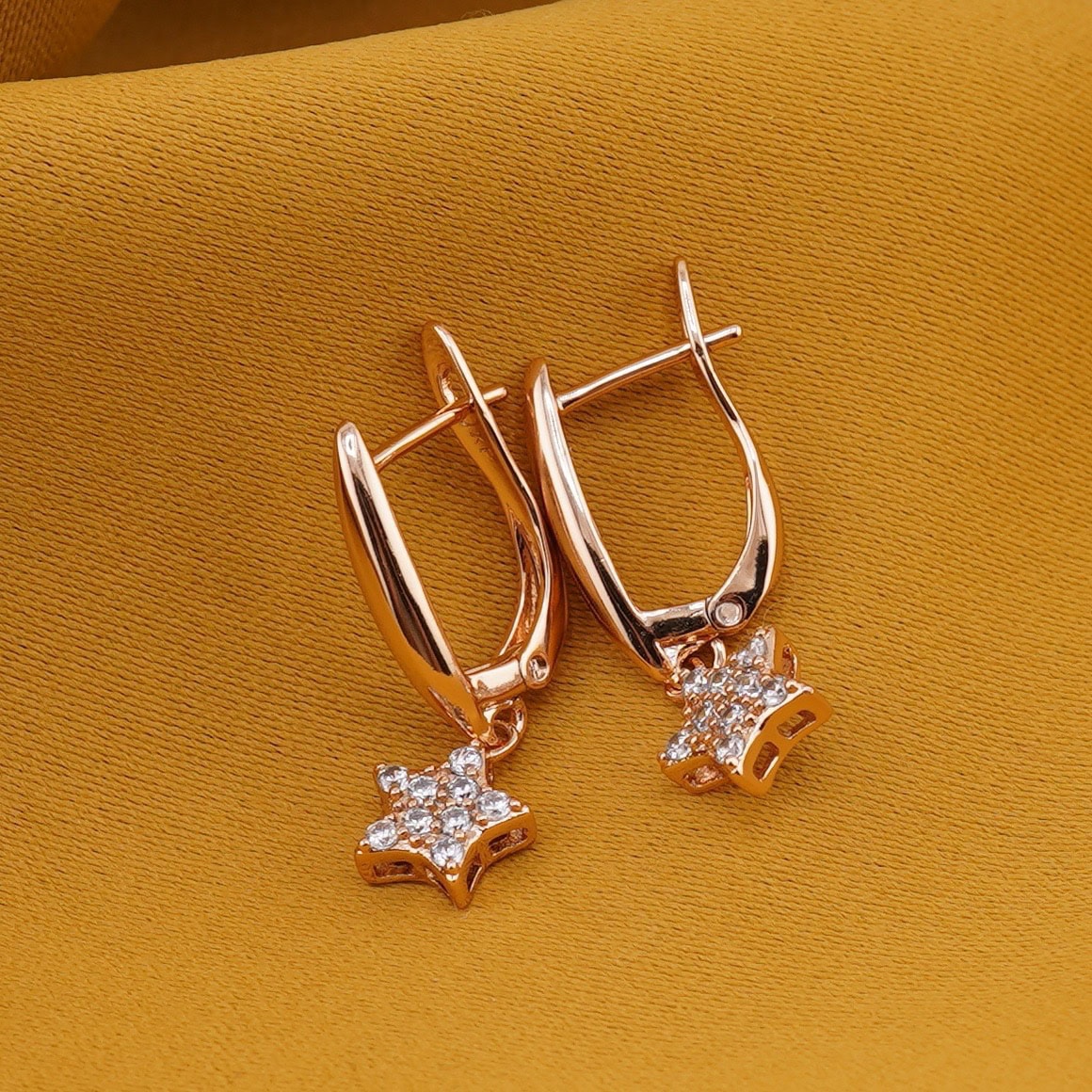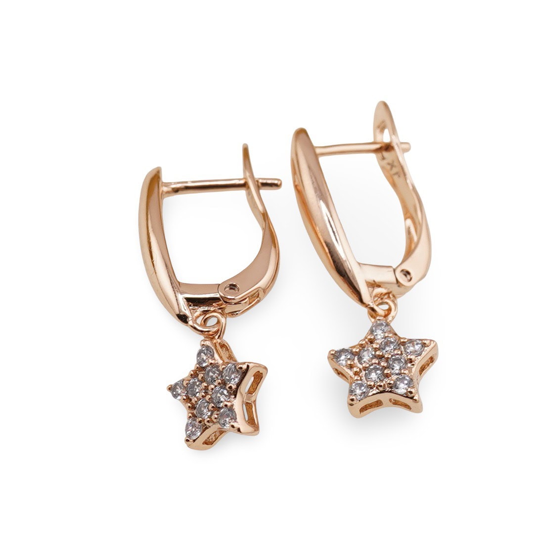 Cercei din cupru placat cu aur roz 18k, model alungit cu steluță și zirconii