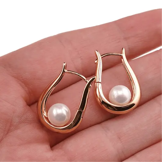 Cercei din cupru placat cu aur roz 18k model harpa cu perla, 22mm.