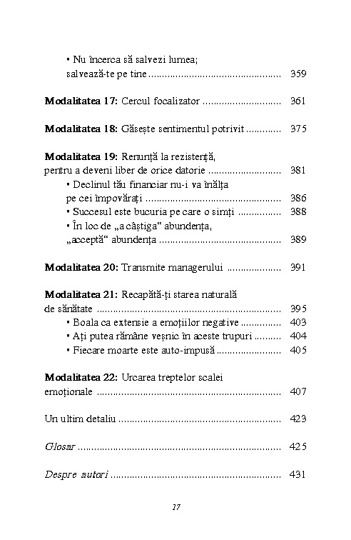 Cele douăzecișidouă de modalități puternice prezentate în carte îți vor schimba pozitiv experiența de viață și te vor ajuta să te transformi într-o persoană care este în mod deliberat creatorul magnific al propriei sale realități. Nu uita că: nu există nimic din ce nu poți să fii, să faci sau să ai; ești o Ființă binecuvântată care a venit în acest mediu fizic pentru a crea. Așadar,