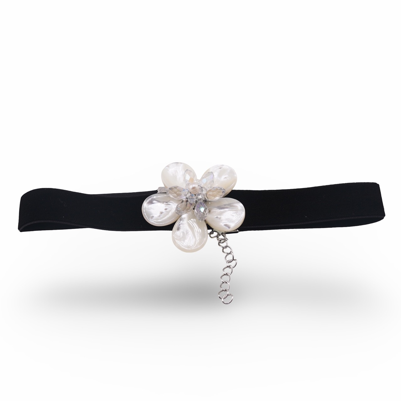 Chokerul cu model floare din sidef alb și sticlă, cu lungimea de 30 cm, este o alegere delicată pentru tine dacă îți dorești un colier aproape de gât, ușor de purtat zi de zi. Aspectul său catifelat, susținut de un material textil plăcut la atingere, pune în valoare floarea de sidef, cunoscut și ca Mother of Pearl, apreciat pentru nuanțele sale calde și reflexiile discrete.