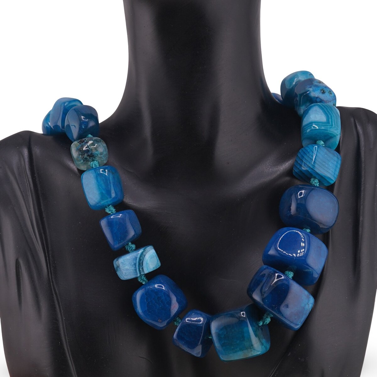 Pietrele sunt cristale naturale de agat, ulterior vopsite pentru a obține această cromatică profundă, accentuând textura și desenul specific fiecărei bucăți de piatră. Formele variate, de tip nugget și sfere, creează un colier cu aspect autentic, în care fiecare rondelă, cu dimensiuni cuprinse aproximativ între 10 și 25 mm, adaugă volum și prezență bijuteriei. Lungimea de aproximativ 55 cm face ca acest colier să se așeze confortabil la baza gâtului sau ușor mai jos, evidențiind linia decolteului fără să fie incomod.
