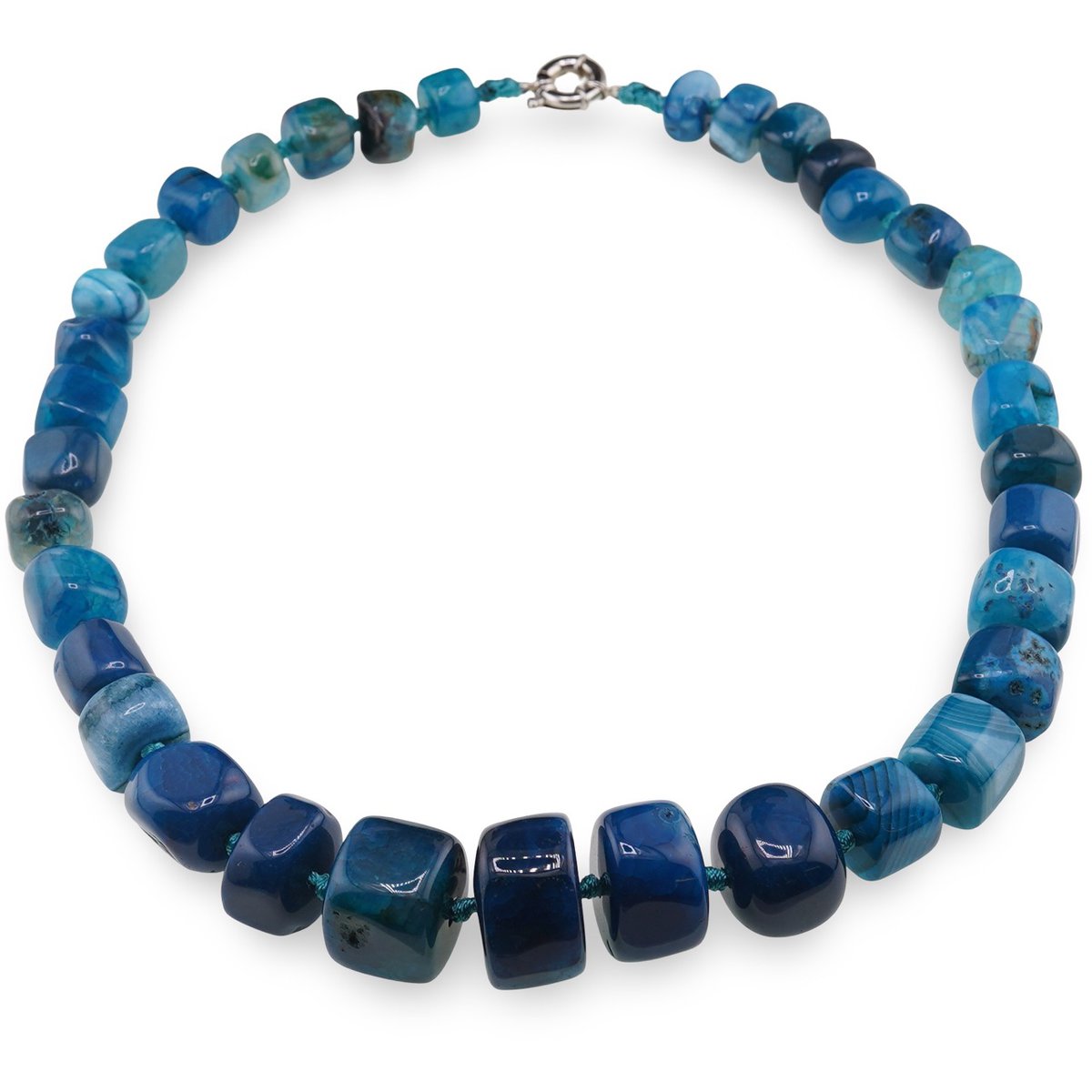 Colierul din agat albastru cu rondele mari este o alegere inspirată pentru tine dacă îți dorești un accesoriu vizibil, cu personalitate, care să aducă în ținută o notă de calm și claritate. Nuanțele de albastru, de la tonuri mai deschise până la accente intense, se combină într-un joc plăcut de culoare, ușor de integrat atât în ținute casual, cât și în combinații elegante.