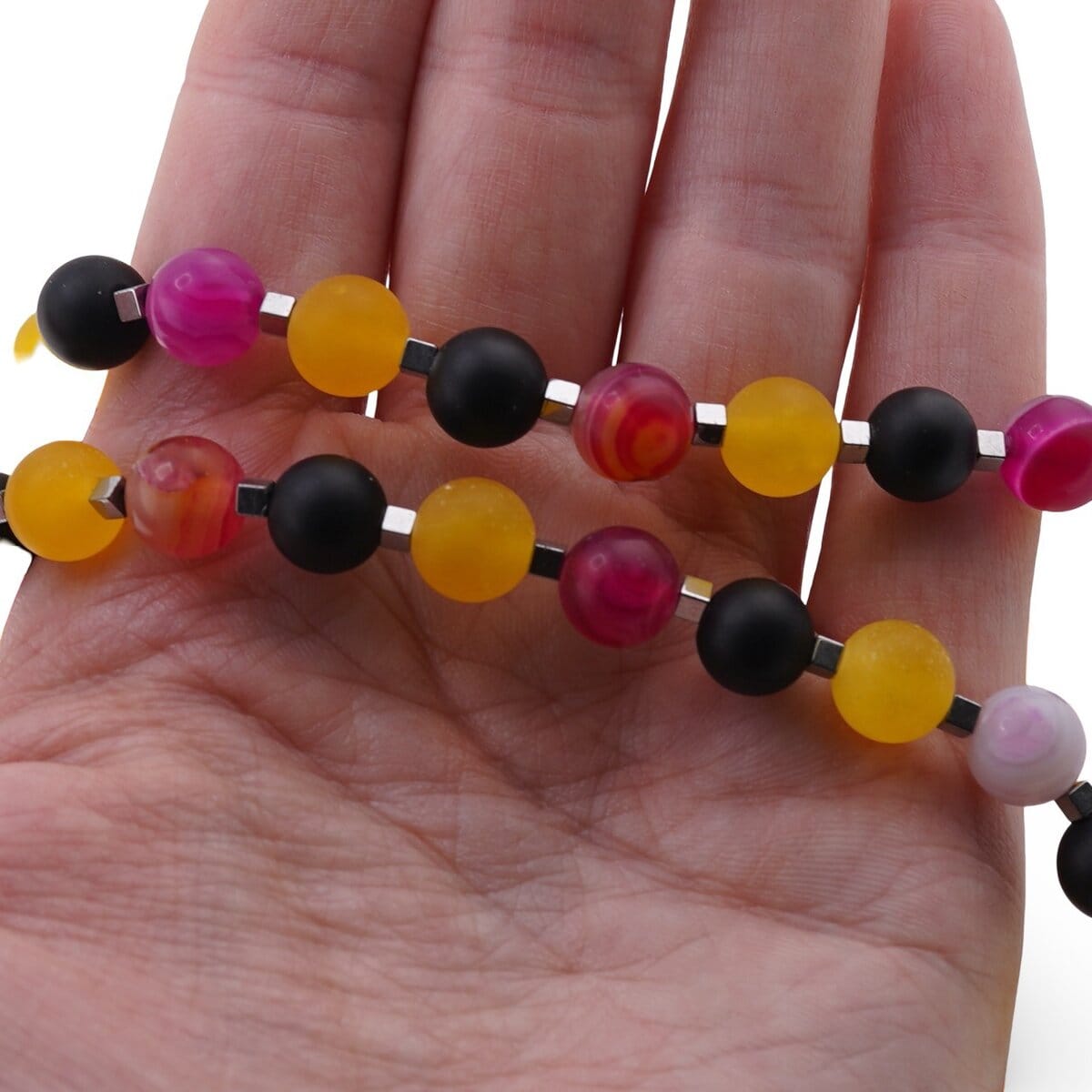 Dacă îți dorești un colier din pietre semiprețioase care să te susțină în momentele cheie, acest mix de Agat galben și roz, Onix și Hematit te poate însoți cu protecție, stabilitate și energie echilibrată, exact când ai mai multă nevoie.
