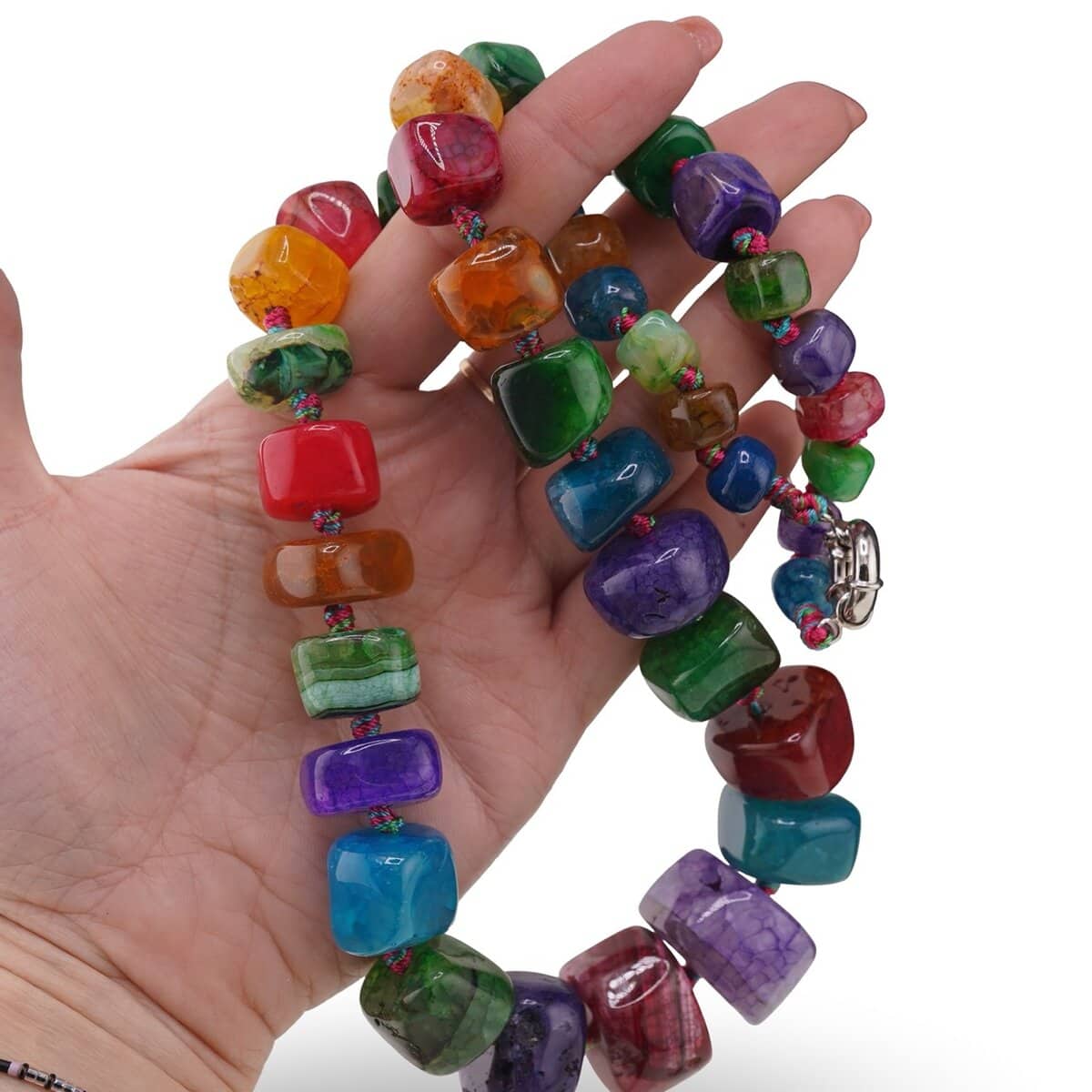 Agatul multicolor este apreciat de multe persoane pentru modul în care combină nuanțe diferite într-o singură piesă de bijuterie. Culorile vii ale cristalului natural vopsit aduc un plus de energie ținutelor, iar jocul dintre tonurile calde și reci îți oferă libertate completă în alegerea combinațiilor vestimentare. Colierul se potrivește atât în contexte casual, la birou sau la plimbare, cât și la evenimente în care vrei să adaugi un accent colorat look-ului tău.