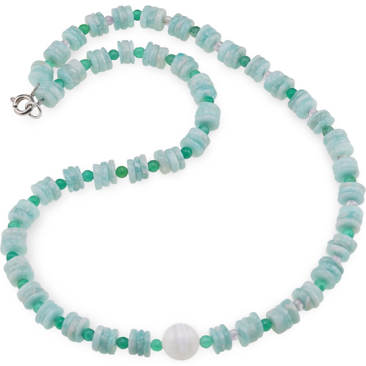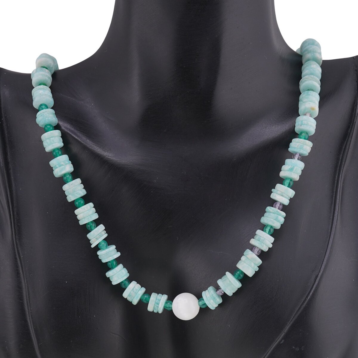 Acest colier din cristale naturale îmbină, într-un mod armonios, nuanțe de alb, albastru și mov, puse în valoare de accente de verde intens. Rondelele de amazonit de 7 mm se împletesc cu sferele fine de ametist și onix verde de 3 mm, iar în centru strălucește o sferă de selenit de 10 mm, care atrage privirea și susține energia întregului colier.