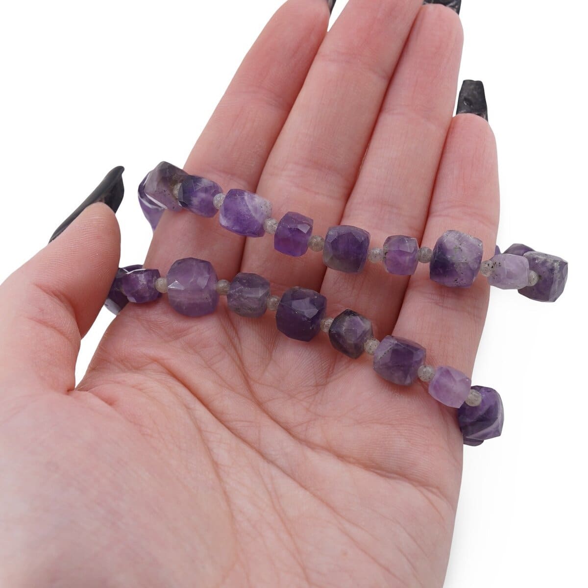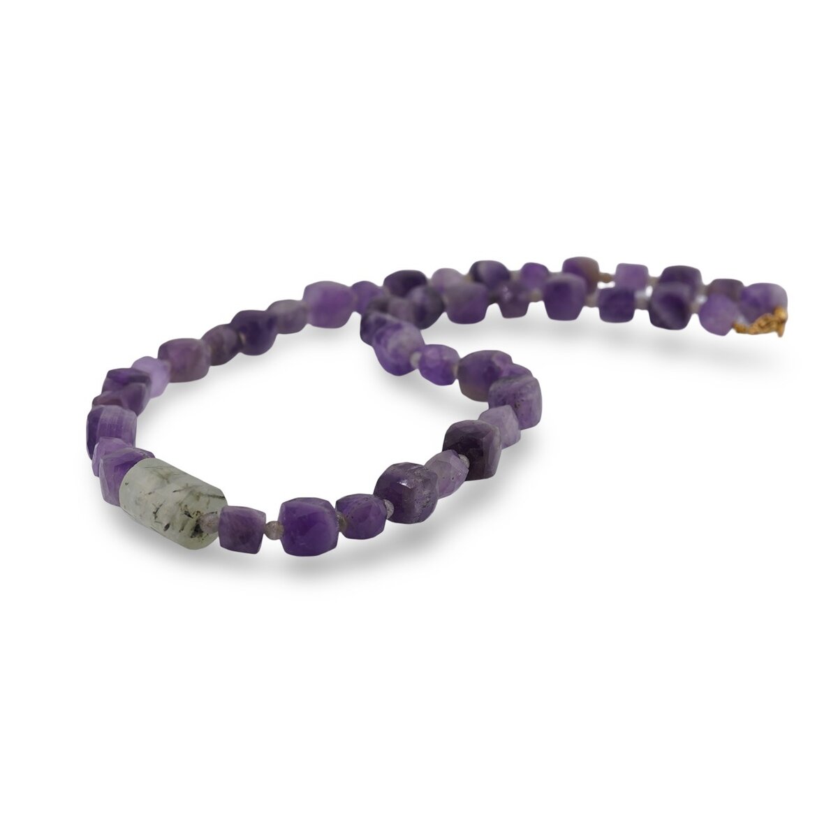 Un colier din cristale naturale, creat pentru tine, cu tonuri discrete de gri, mov și verde. Ametistul în cuburi fațetate, Labradoritul în sfere fine și Prehnitul în tuburi fațetate se îmbină într-o bijuterie echilibrată, ușor de purtat zi de zi. Lungimea de aproximativ 43 cm și varietatea de forme (cub, sferă, tub) oferă o prezență elegantă, păstrând un stil curat și natural.
