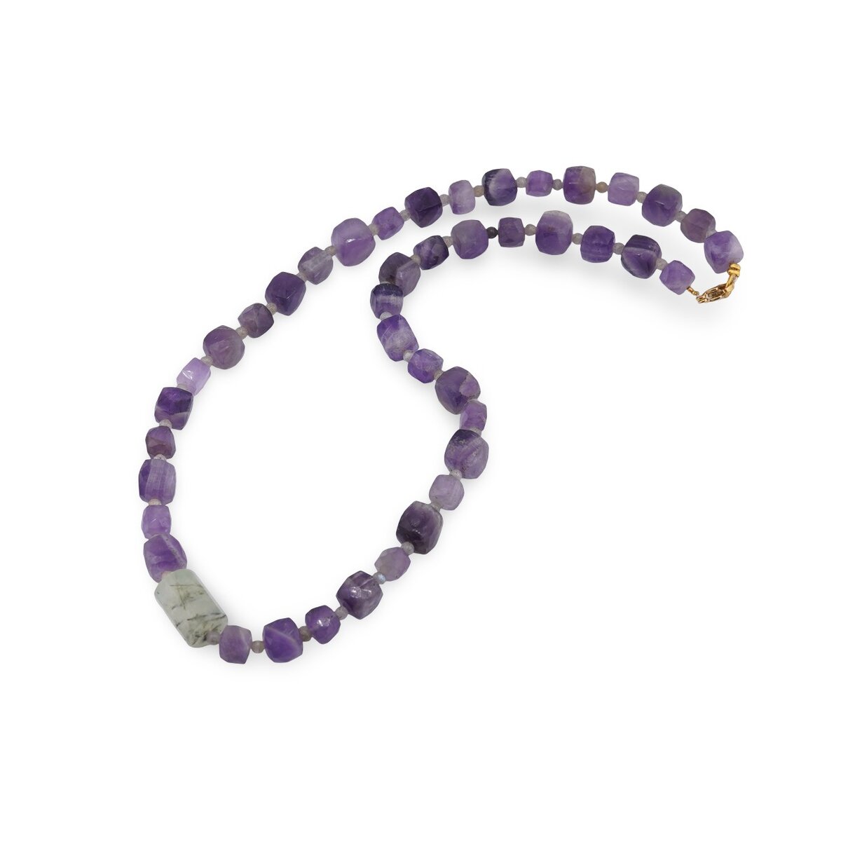 Colier Ametist cuburi fațetate 6–8 mm, Labradorit sfere 3 mm și Prehnit tub 19–20 mm