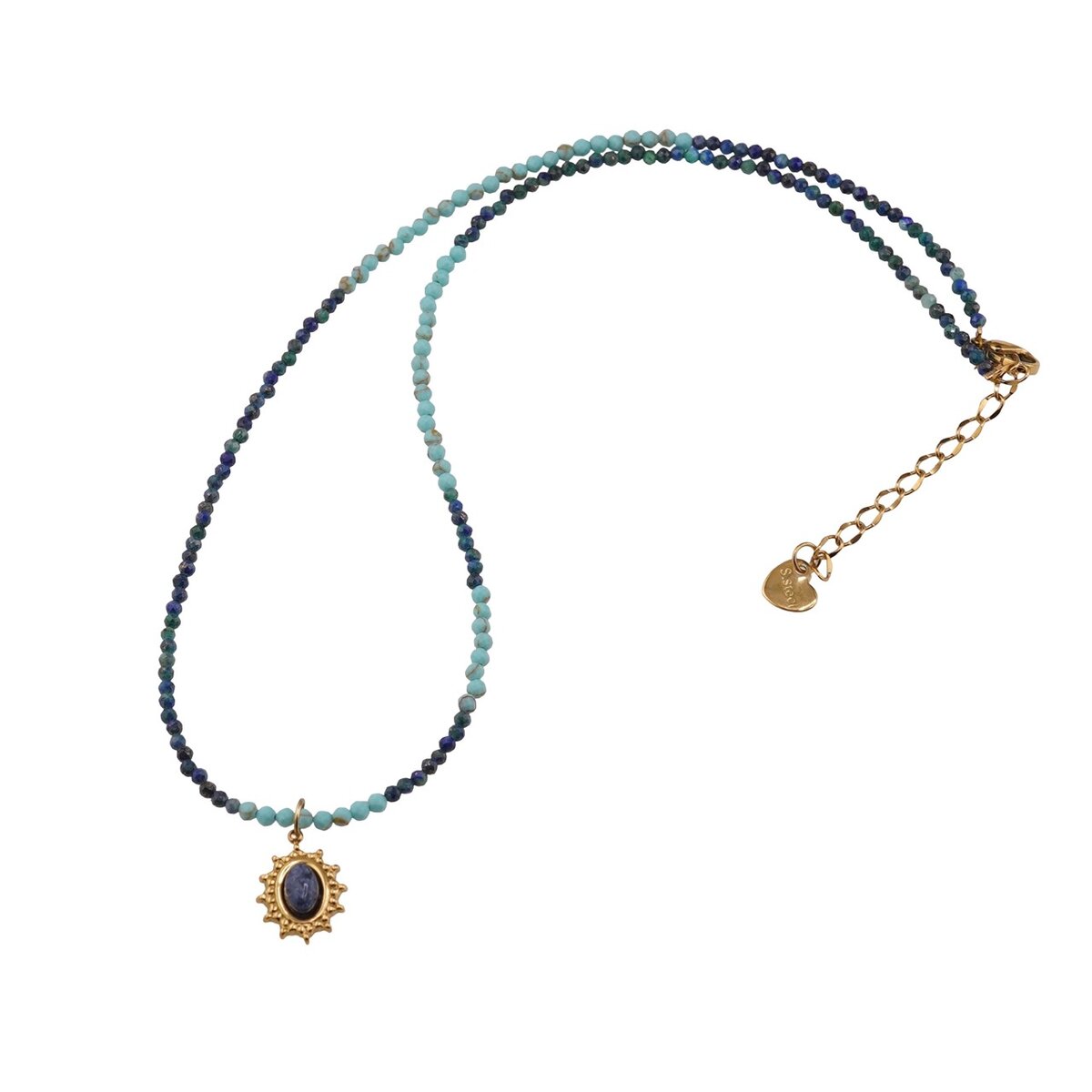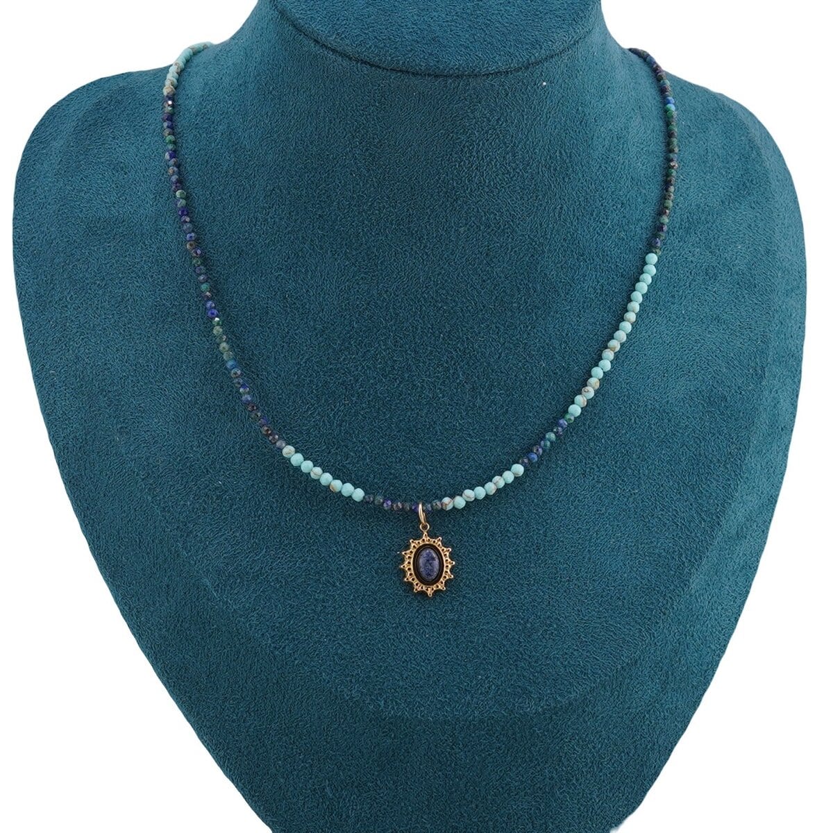 Acest colier fin îmbină într-un mod armonios frumusețea nuanțelor de albastru cu energia blândă a cristalelor naturale. Șiragul este format din sfere fațetate de azurit și turcoaz de aproximativ 2 mm, puse în valoare de un pandantiv din sodalit, creând un accesoriu discret, plăcut de purtat zi de zi.