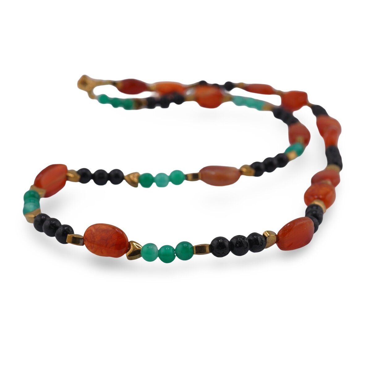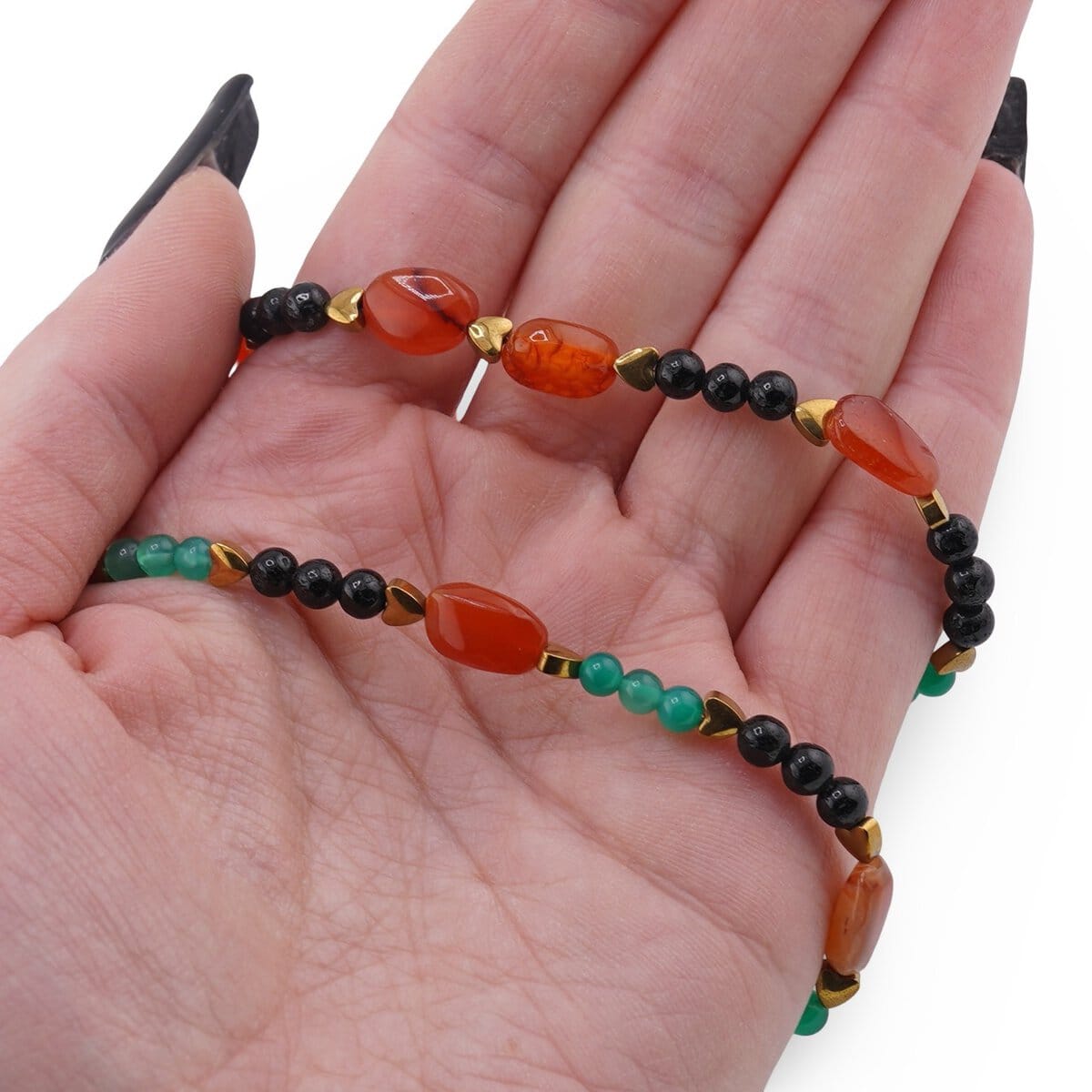 Un colier multicolor creat pentru echilibru și energie în viața de zi cu zi. Pietrele de carneol cu forme neuniforme (8–15 mm) se îmbină armonios cu sferele de onix verde și turmalină neagră de 4 mm, accentuate de inimioare din hematit auriu de 4 mm. Are o lungime de aproximativ 43 cm și se așază confortabil la baza gâtului. Cristalele sunt naturale 100%, unele elemente fiind tratate pentru a obține nuanțe și reflexii calde, potrivite pentru un look versatil.