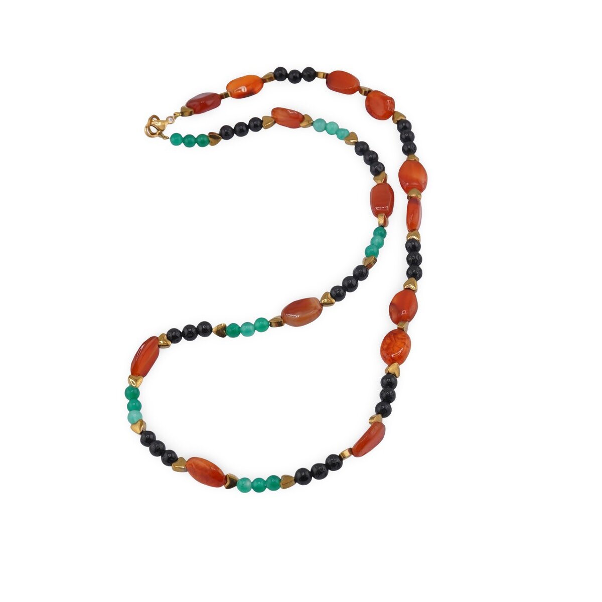 Colier Carneol neuniform 8-15mm, Onix verde si Turmalina neagra sfere 4mm cu Hematit auriu inimi 4mm