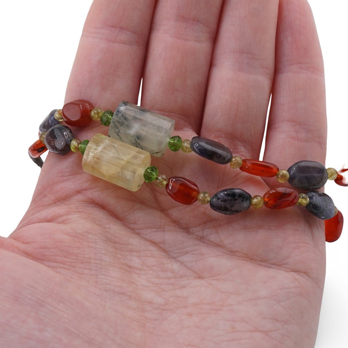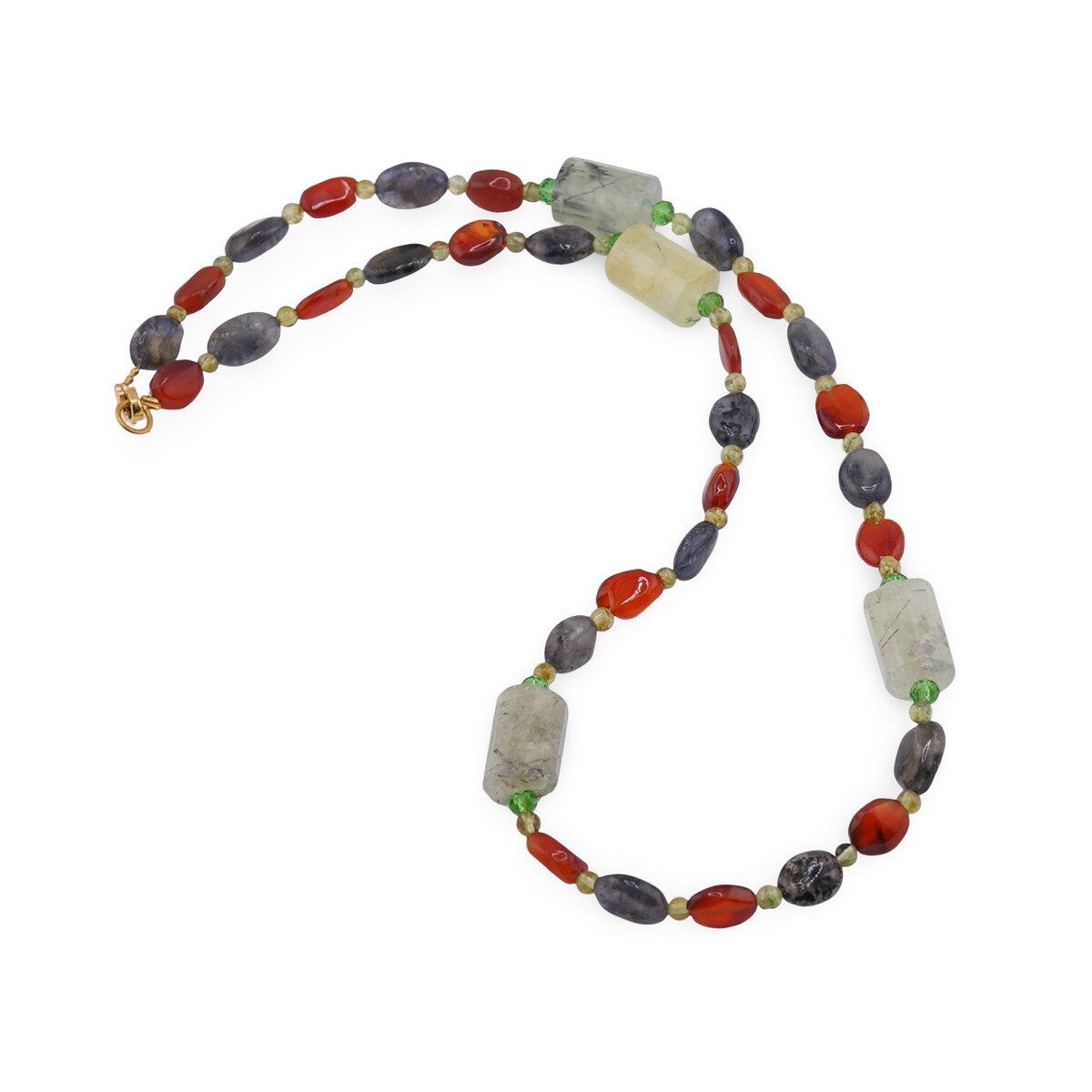 Colier Carneol si Iolith neuniform 8-10mm, Peridot sfere 3mm si Prehnit tuburi fațetate 14mm