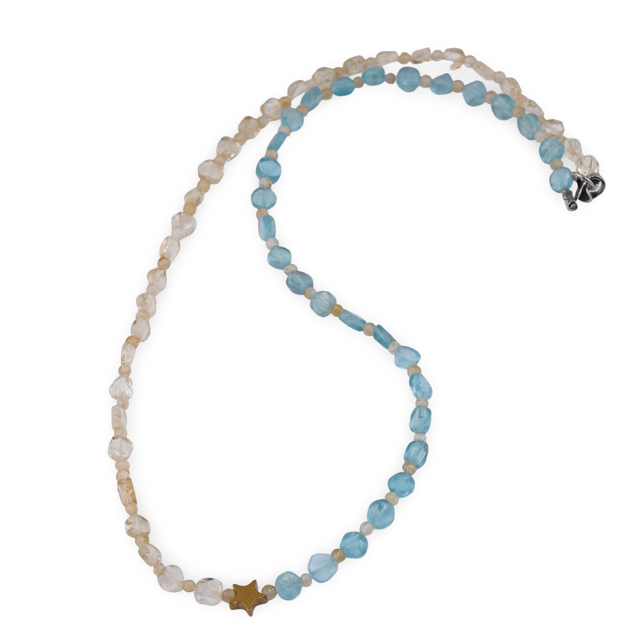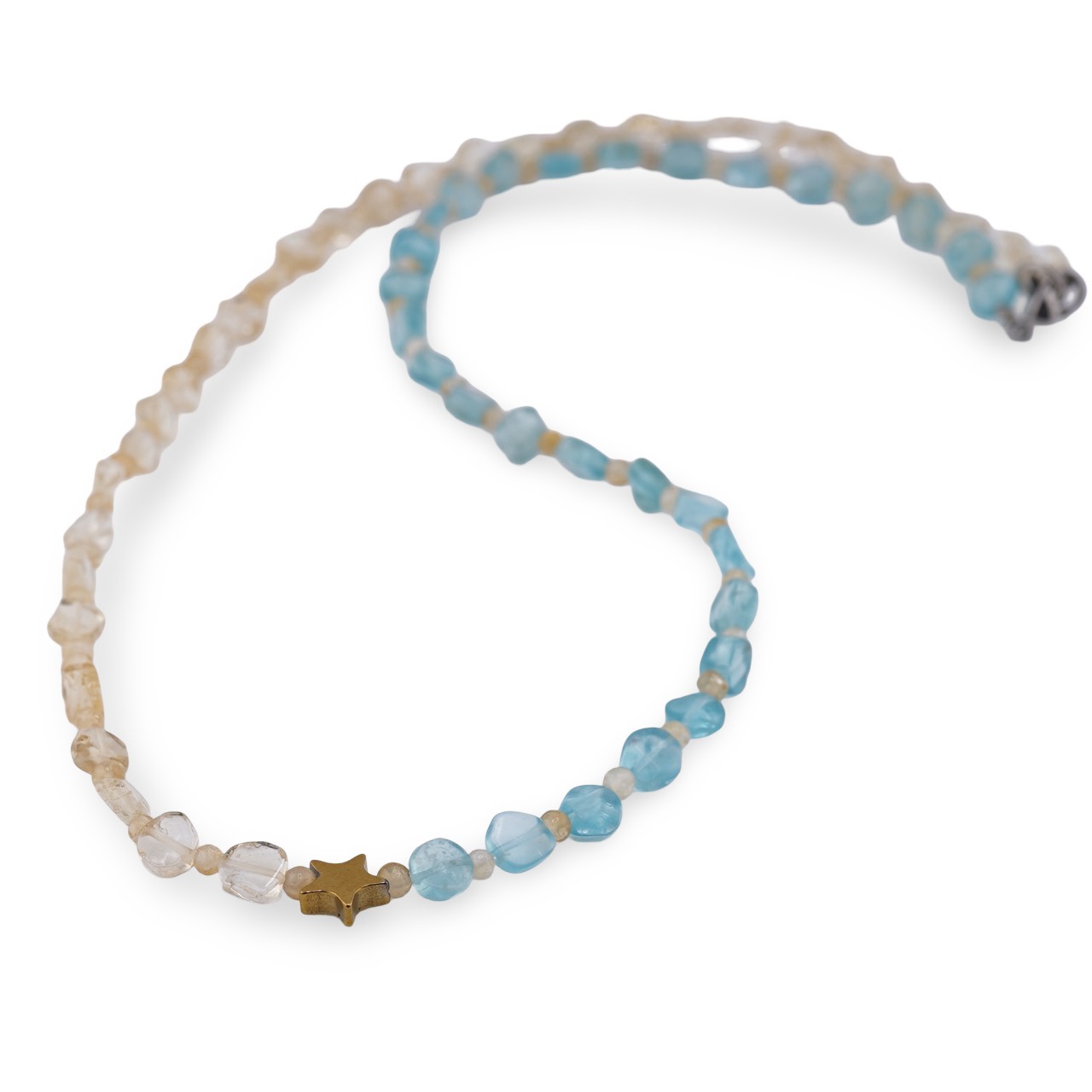 Un colier cu energie caldă și echilibrantă, creat pentru zilele în care ai nevoie de claritate și curaj. Piesele din citrin și apatit în formă de bănuți de 5 mm alternează cu sfere fine de 2–3 mm, iar hematitul auriu în formă de steluță adaugă un accent luminos. Paleta albastru–galben–auriu se potrivește ușor cu ținutele de zi sau de seară, iar lungimea de aproximativ 43 cm îl face comod de purtat aproape de claviculă. Colierul este realizat din cristale naturale 100%.