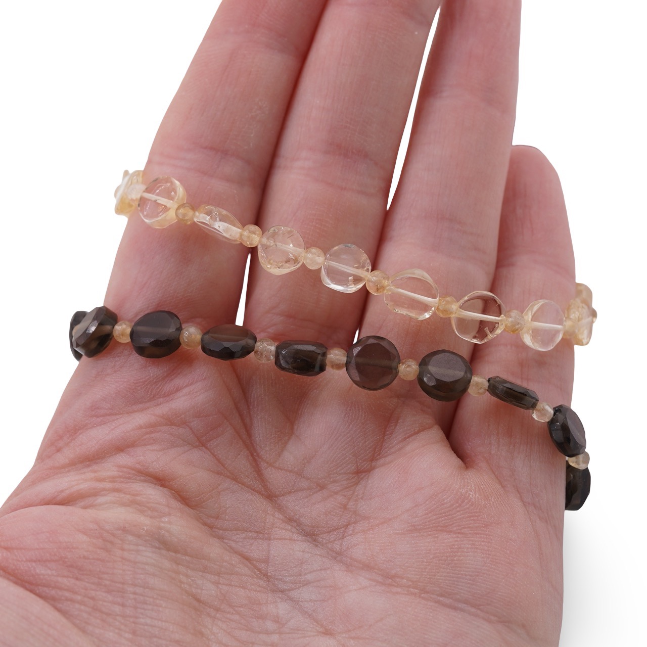 Colier Citrin bănuți 6–7 mm, sfere 3 mm și Cuart fumuriu bănuți fațetați 7 mm cu Hematit auriu steluță