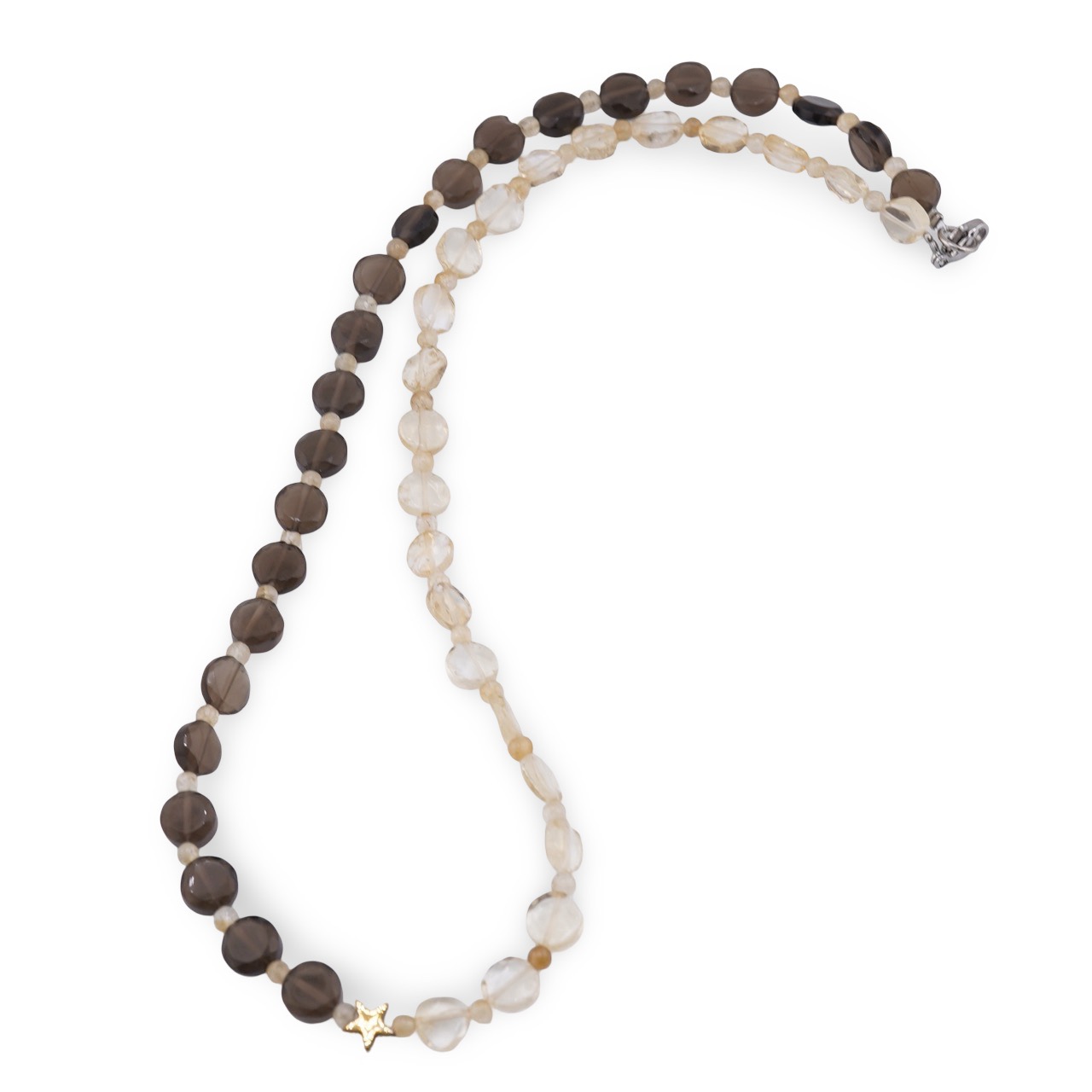 Un colier creat pentru tine, în care lumina caldă a citrinului se întâlnește cu tonurile gri ale cuartului fumuriu și cu strălucirea discretă a unei steluțe din hematit auriu. Piesele sunt din cristal natural 100%, lucrate în forme plăcute: bănuți de 6–7 mm, sfere delicate de 3 mm și bănuți fațetați de 7 mm care prind frumos lumina. Cu o lungime de 43 cm, colierul cade elegant la baza gâtului și se poartă comod zi de zi.