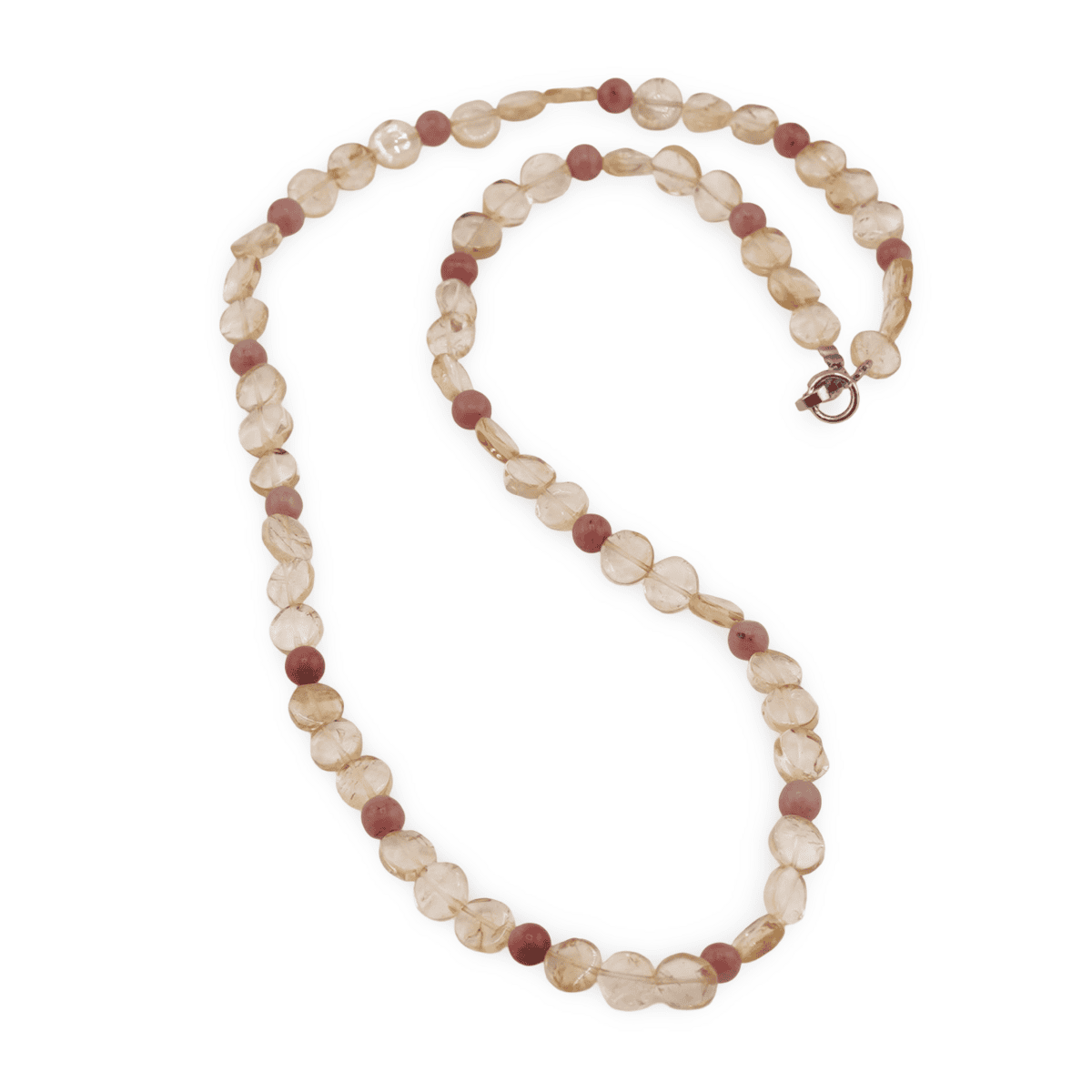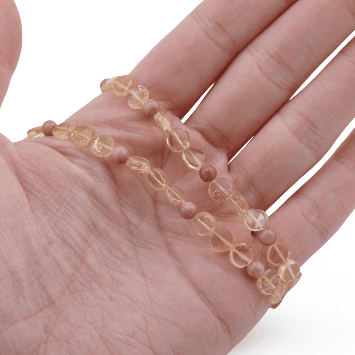 Un colier gândit pentru echilibru și energie, în care galbenul cald al citrinului se întâlnește cu rozul blând al rodonitului. Piesele de citrin tăiate sub formă de bănuți de aproximativ 6 mm alternează natural cu sferele de rodonit de circa 4 mm, iar lungimea de 43 cm îl face comod de purtat aproape de claviculă. Realizat din cristale naturale 100%, colierul reunește calitățile a două pietre îndrăgite pentru simbolistica lor: citrinul, cunoscut și ca cuart galben sau citrine, și rodonitul, întâlnit și ca rhodonite ori silicat de mangan.