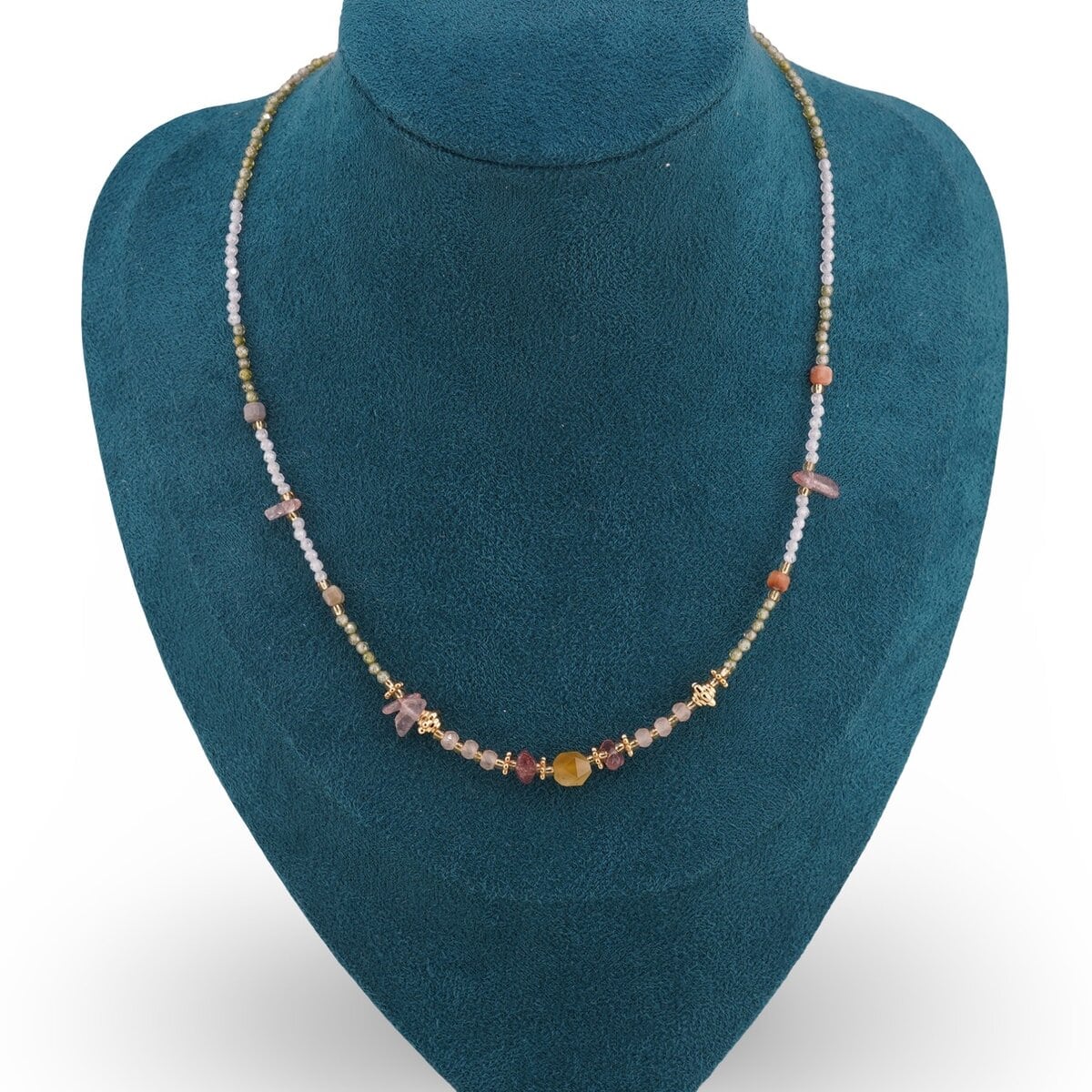 Colierul este realizat din cristale de aproximativ 2–10 mm, așezate armonios pe o lungime de 40 cm, astfel încât să se așeze confortabil la baza gâtului. Datorită nuanțelor multicolore discrete, se potrivește ușor cu diverse ținute și stiluri, fiind potrivit atât pentru zilele obișnuite, cât și pentru momente în care vrei să îți simți energia mai bine ancorată.