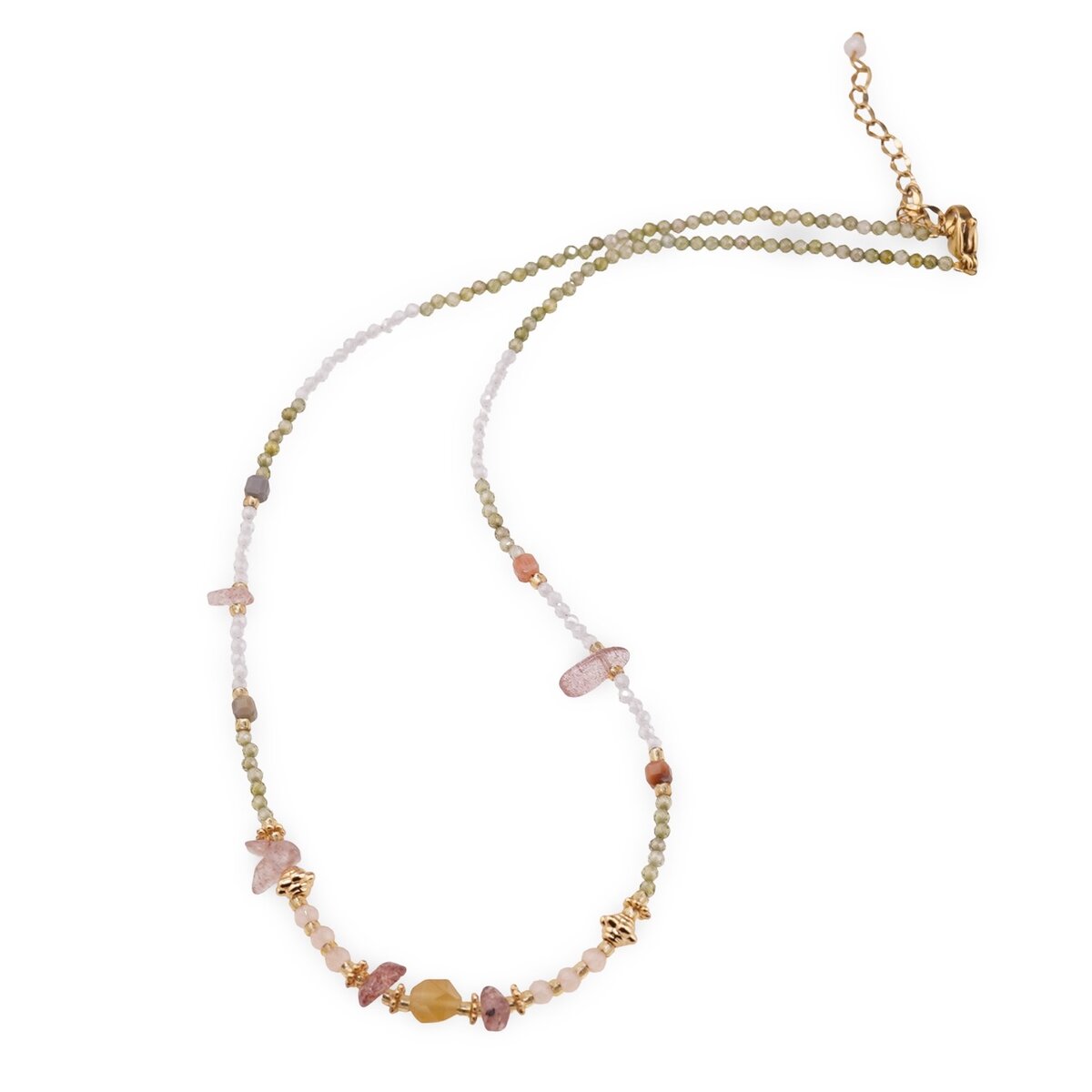 Colier Cristal de stâncă fațetat 2mm, Agat Verde fațetat 2mm, mix cristale și elemente aurii