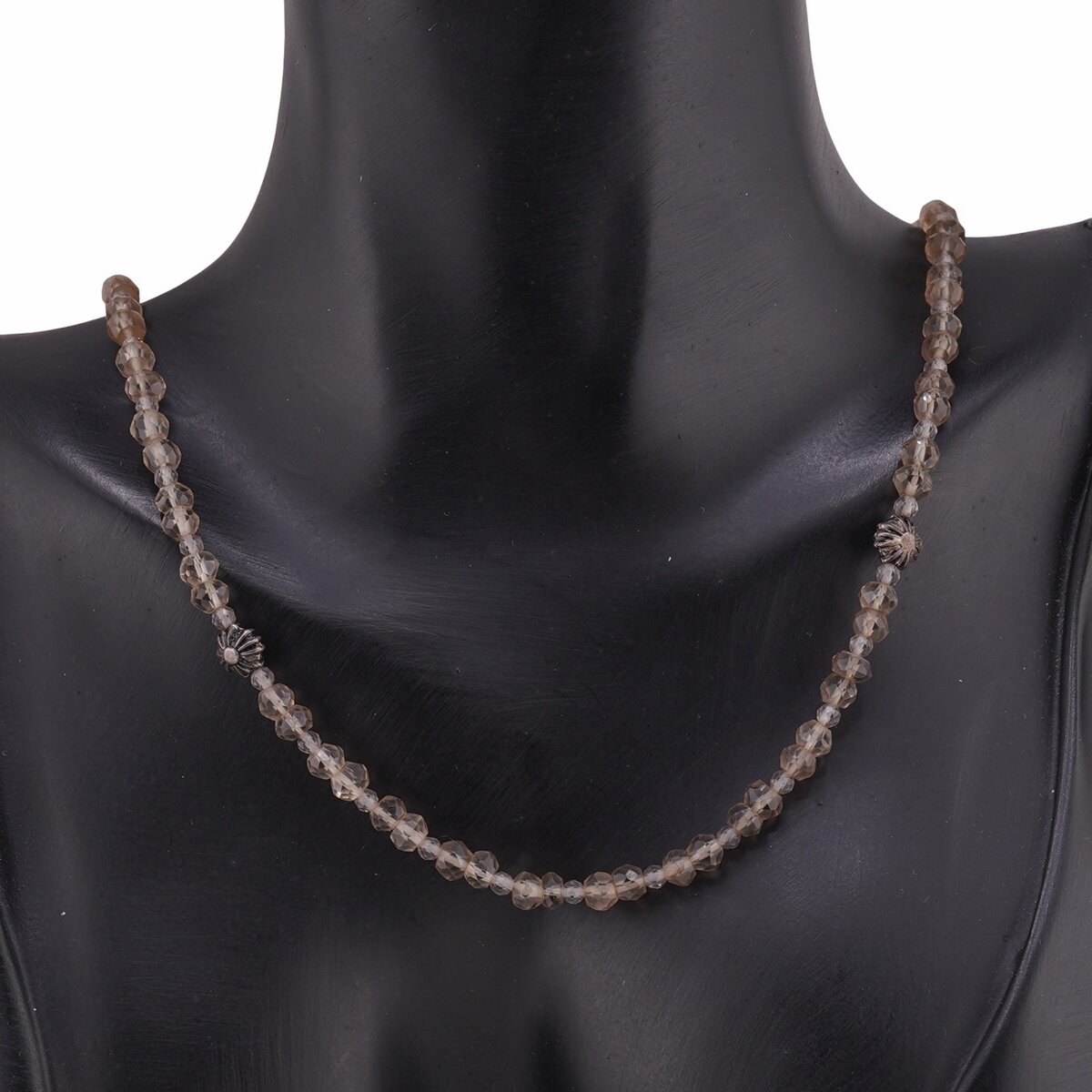 Descoperă un colier gândit pentru rafinament discret și purtare zilnică. Cuartul fumuriu, cu nuanțe naturale de gri, îți aduce la gât o lumină calmă, pusă în valoare de alternanța dintre discurile fațetate de 4 mm și micile sfere fațetate de 2 mm. Jocul de volume și tăieturi conferă strălucire moderată, plăcută privirii, fără a încărca ținuta.