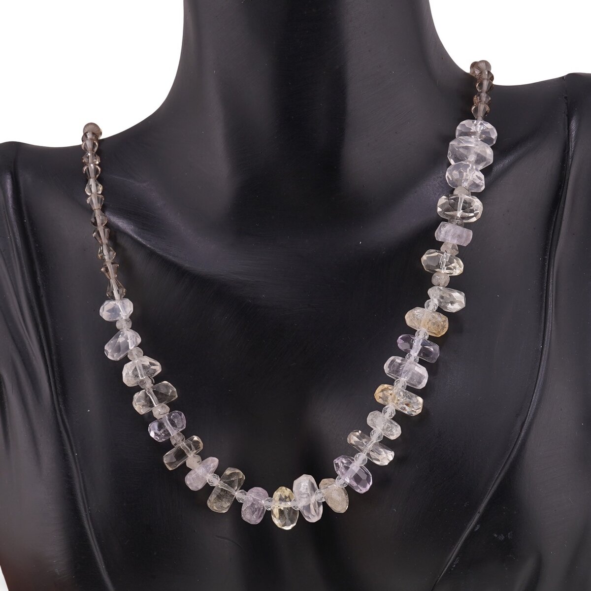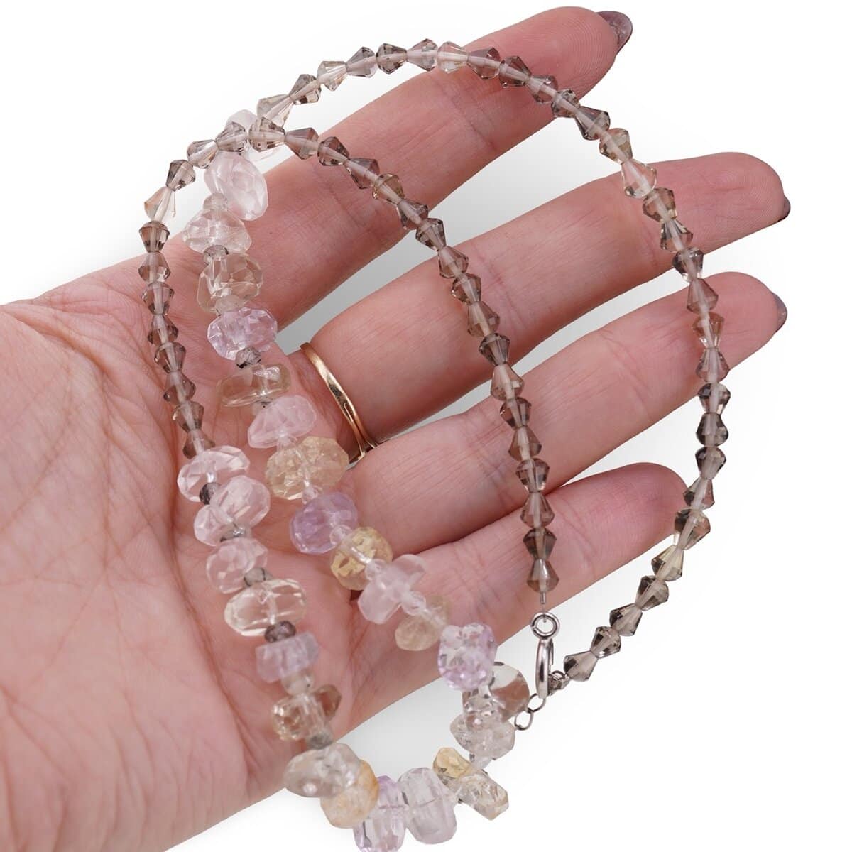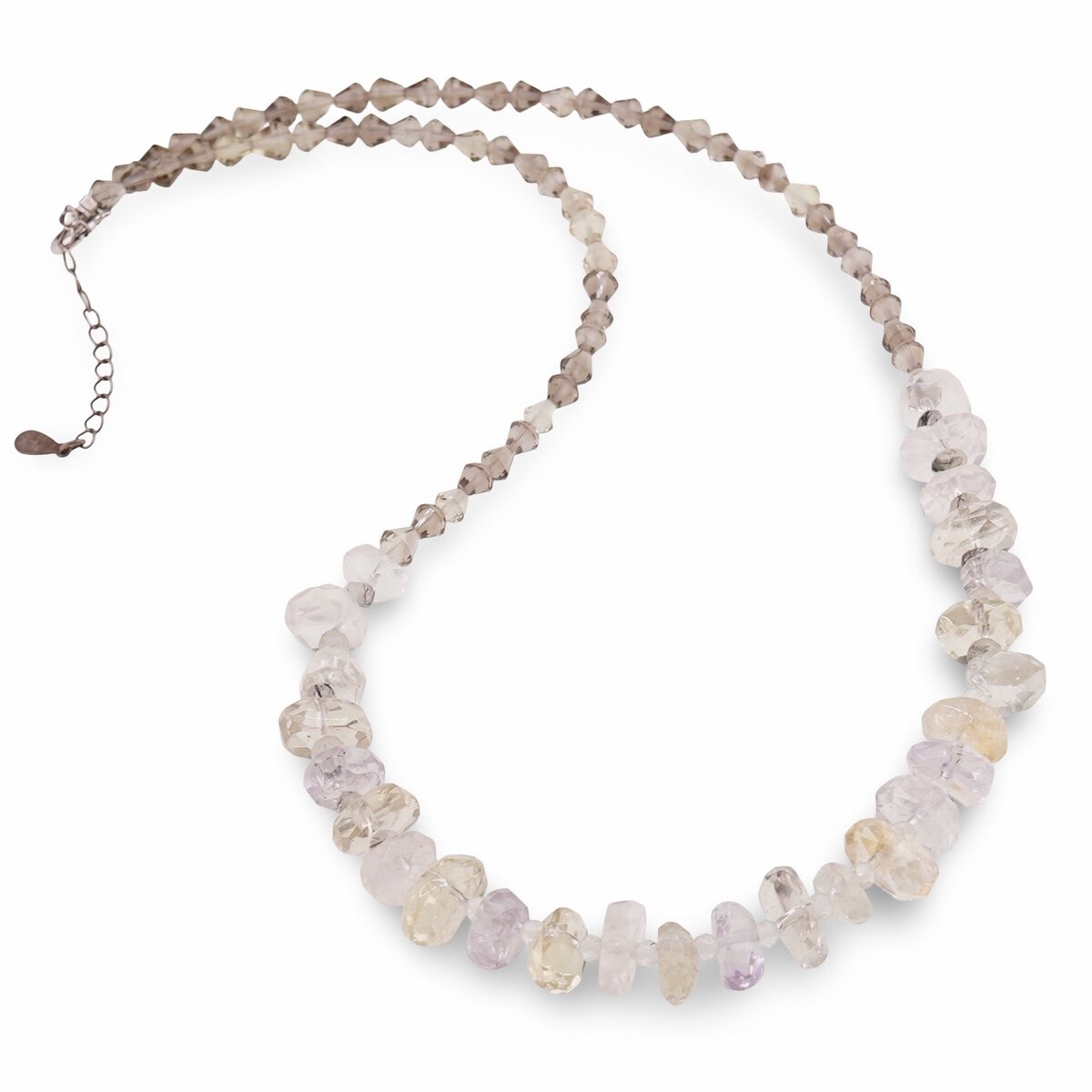 Un colier creat să aducă echilibru cromatic și luciu discret în ținutele tale de zi cu zi. Realizat din cuart fumuriu fațetat de 4 mm și un mix de cristale în formă de discuri fațetate, cu diametre variate între aproximativ 3 și 11 mm, piesa pune în valoare nuanțele pământii și jocul fin al luminii pe fiecare fațetă. Detaliile din argint 925 leagă armonios compoziția, iar lungimea de 45 cm așază colierul confortabil la baza gâtului. Toate pietrele sunt 100% cristale naturale, alese pentru aspectul autentic și culoarea plăcută.