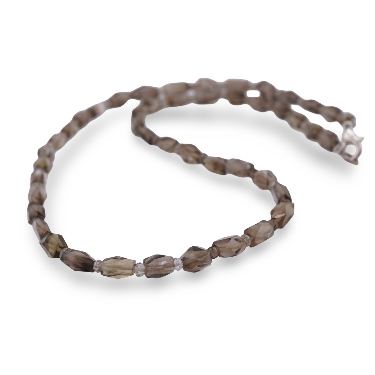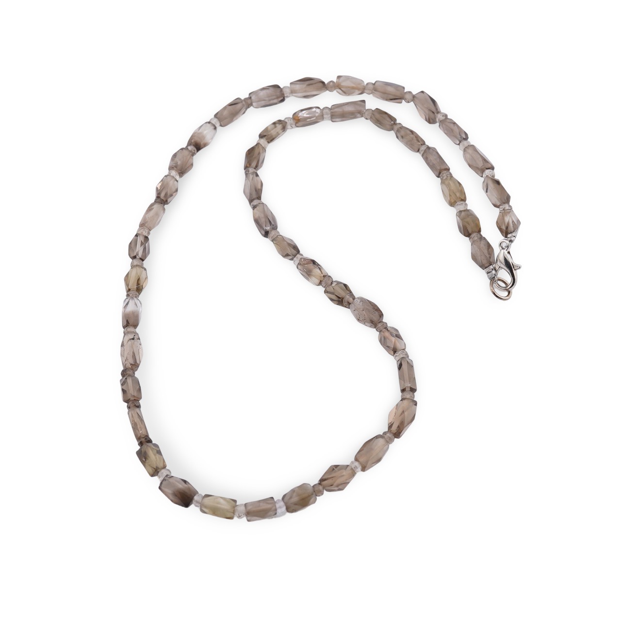 Elementele sunt alese pentru a crea un ritm plăcut pe linia gâtului: tuburi fațetate de aproximativ 6–8 mm se îmbină armonios cu discuri fațetate fine, de circa 3 mm. Jocul dintre forme alungește vizual linia colierului și captează lumina într-un mod subtil, punând în evidență textura specifică cuartului fumuriu.