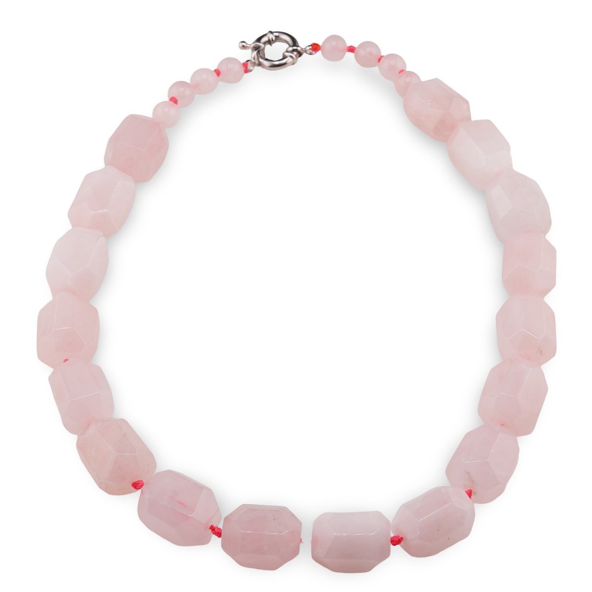 Fiecare piatră este realizată din cristal natural de cuart roz, 100%, astfel încât te bucuri de frumusețea autentică a unei pietre semiprețioase. Forma de nugget, combinată cu elemente de tip sferă, creează un joc interesant de volume, iar fațetarea scoate în evidență reflexiile discrete ale cristalului. Vei observa cum colierul prinde viață la lumină, fără a fi strident.