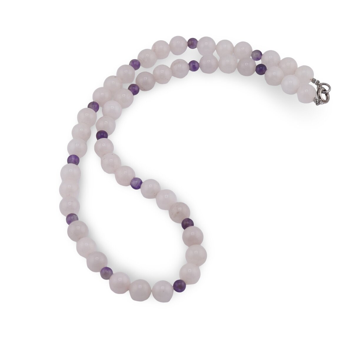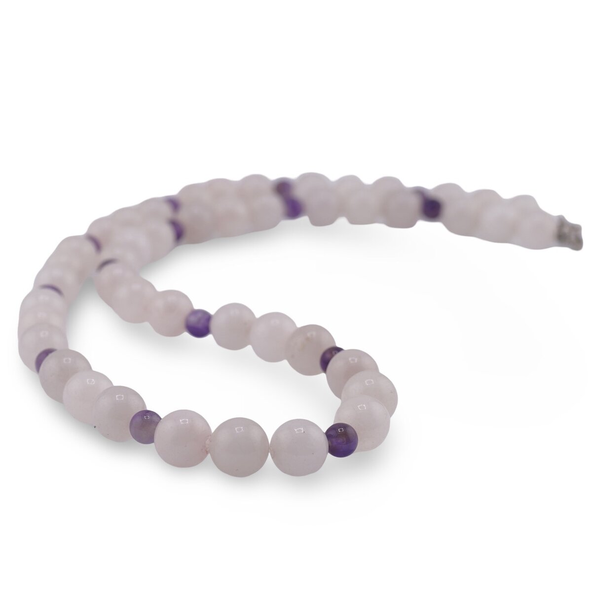 Un colier delicat, gândit pentru tine, care îmbină armonios nuanțele calde de roz cu reflexele mov ale ametistului. Șiragul are 43 cm și aduce împreună sferele de cuart roz de 8 mm cu cele de ametist de 4–5 mm, toate din cristal natural 100%. Textura netedă a formelor sferice așază piesa confortabil la baza gâtului, oferind un aspect echilibrat și ușor de purtat zi de zi.