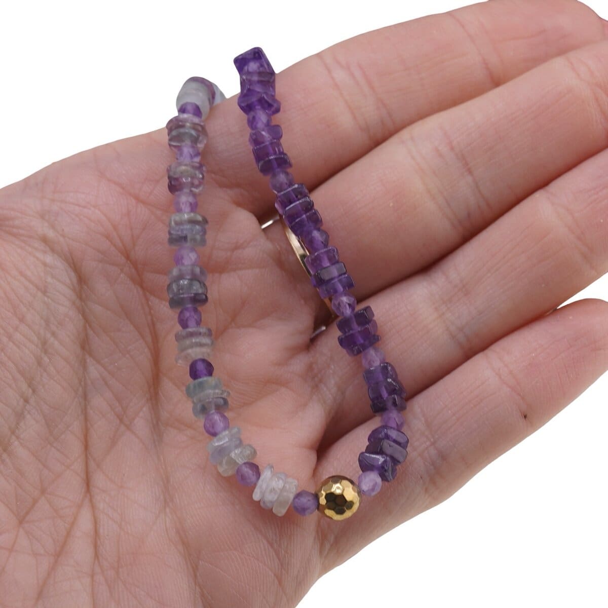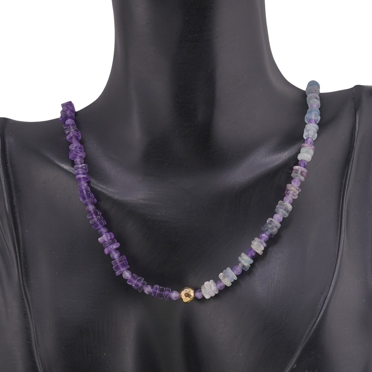 Acest colier din cristale naturale îmbină armonios nuanțele de mov și verde ale fluoritului și ametistului cu accentele calde de hematit auriu, creând un accesoriu fin, potrivit atât pentru fiecare zi, cât și pentru momentele în care ai nevoie de un plus de calm și claritate. Rondelele de fluorit de aproximativ 5 mm, pătrățelele de ametist de 5 mm și sferele fațetate de 4 mm sunt așezate într-un șir echilibrat, pe o lungime de circa 43 cm, astfel încât colierul să se așeze confortabil la baza gâtului.