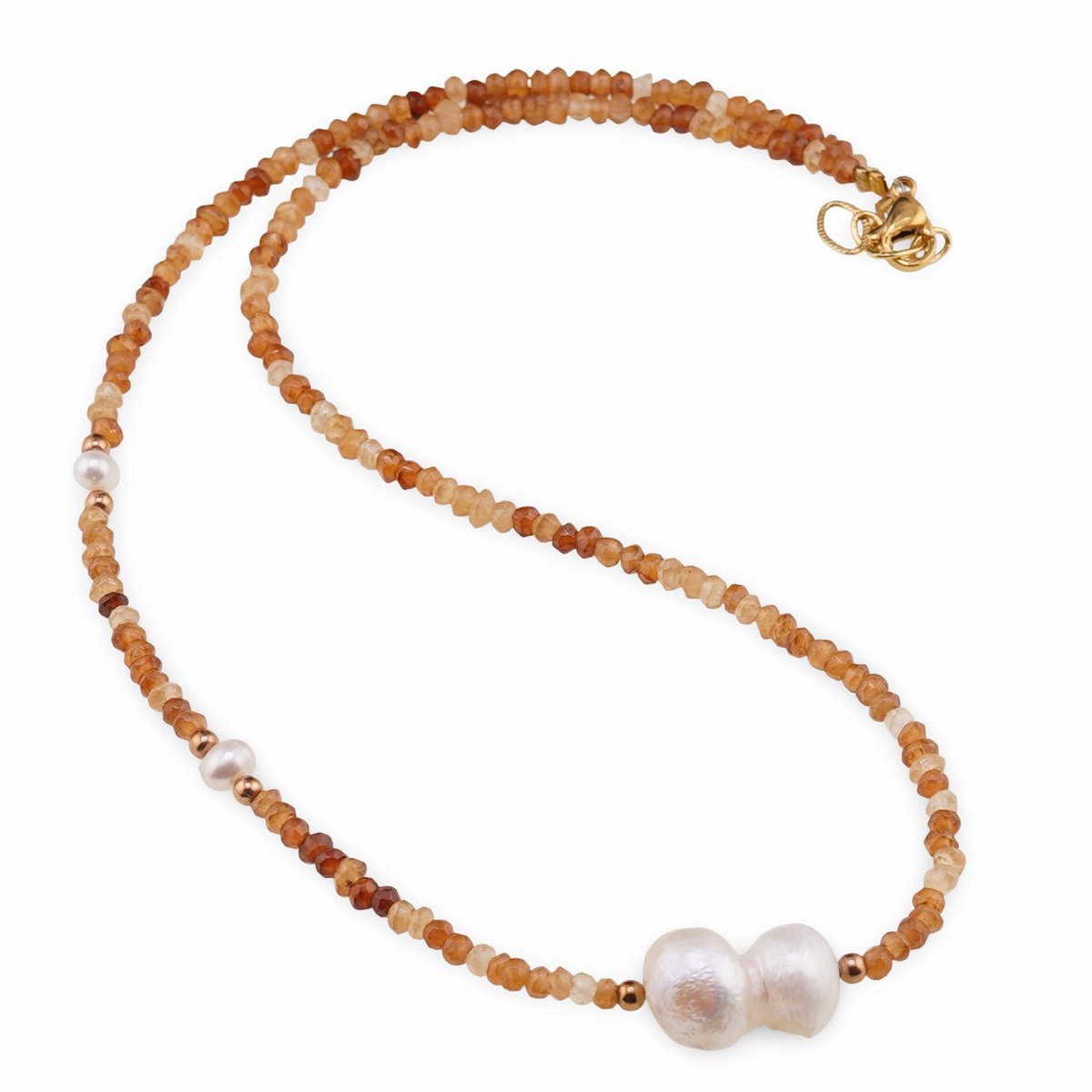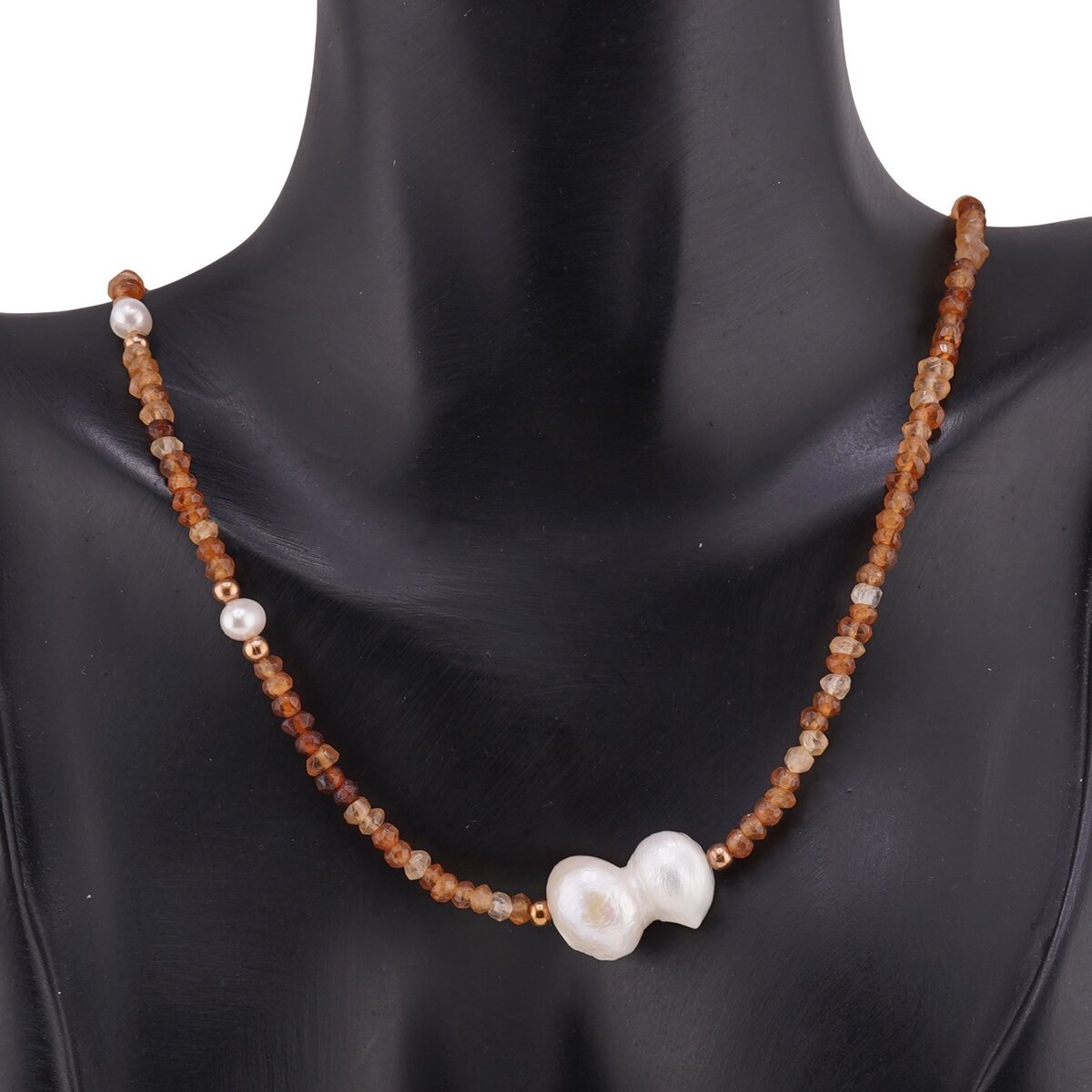 Gândit pentru a te însoți zi de zi, acest colier îmbină căldura granatului hessonit în nuanțe de maro cu strălucirea sidefată a perlelor albe. Discurile fațetate de 3 mm ale granatului se așază armonios lângă perlele de cultură de 5–19 mm, creând un contrast rafinat și ușor de asortat. Lungimea de aproximativ 42–43 cm îl face să cadă elegant la baza gâtului, astfel încât să te bucuri de prezența lui aproape de piele. Piesele sunt realizate din cristal natural 100%, pentru o experiență autentică.