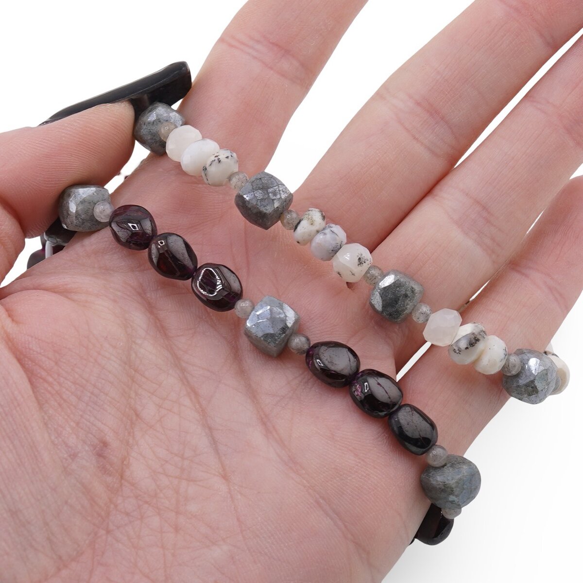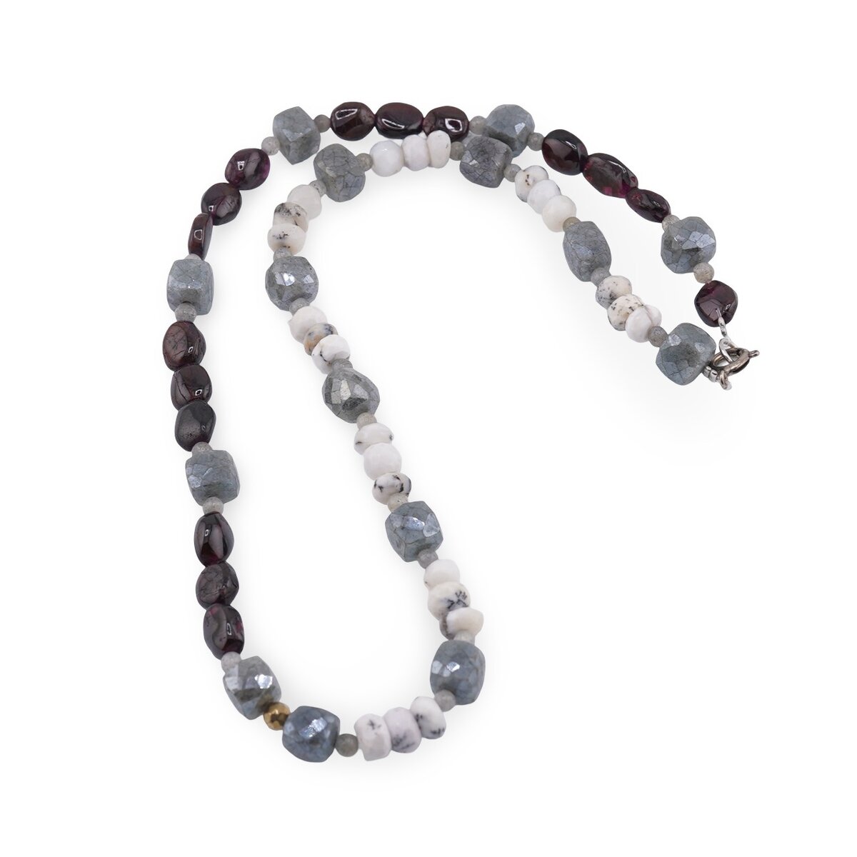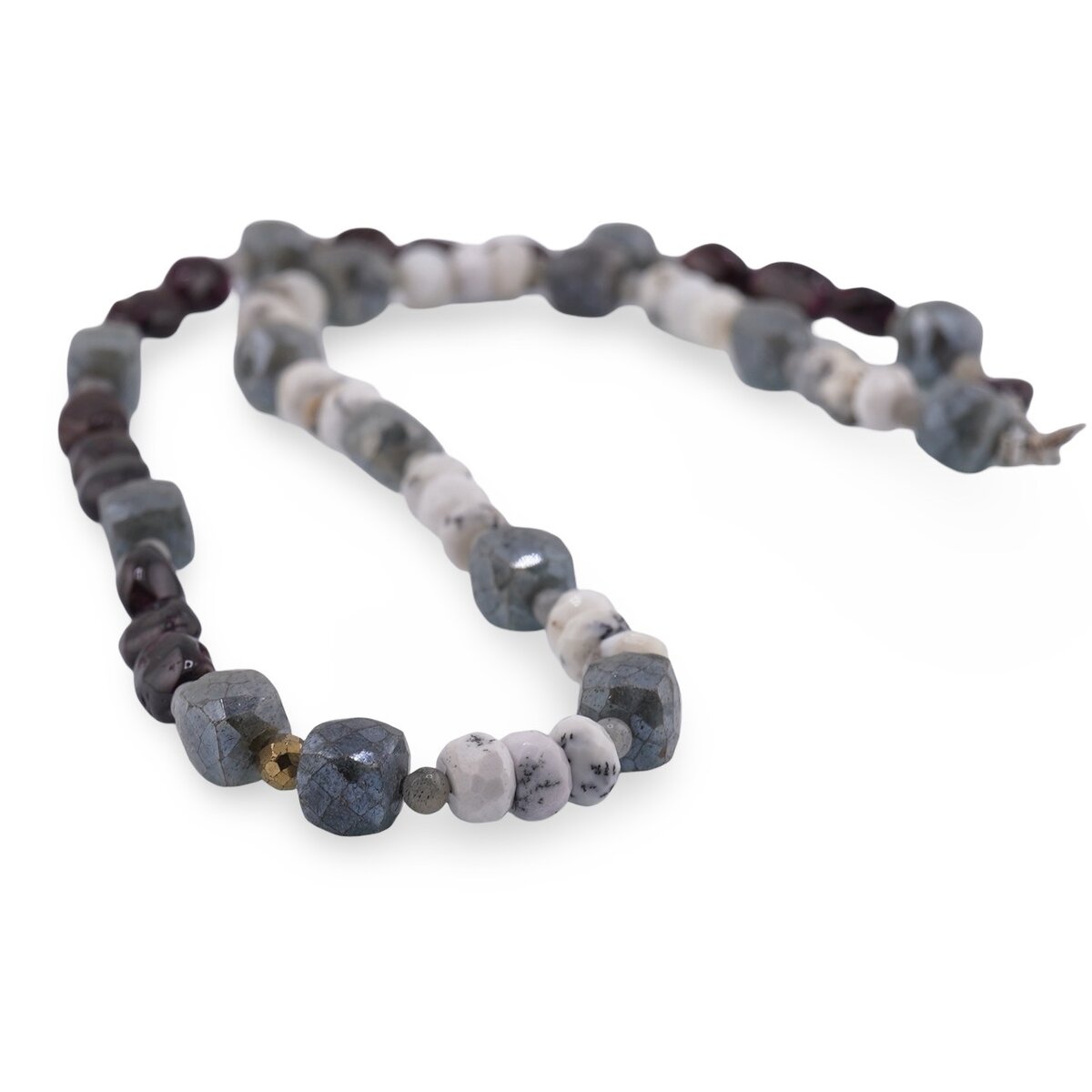 Colier Granat neunifrom 8–10mm, Opal dendritic discuri fațetate 6mm, Labradorit diamantat cuburi fațetate 7–8mm și sfere 3mm