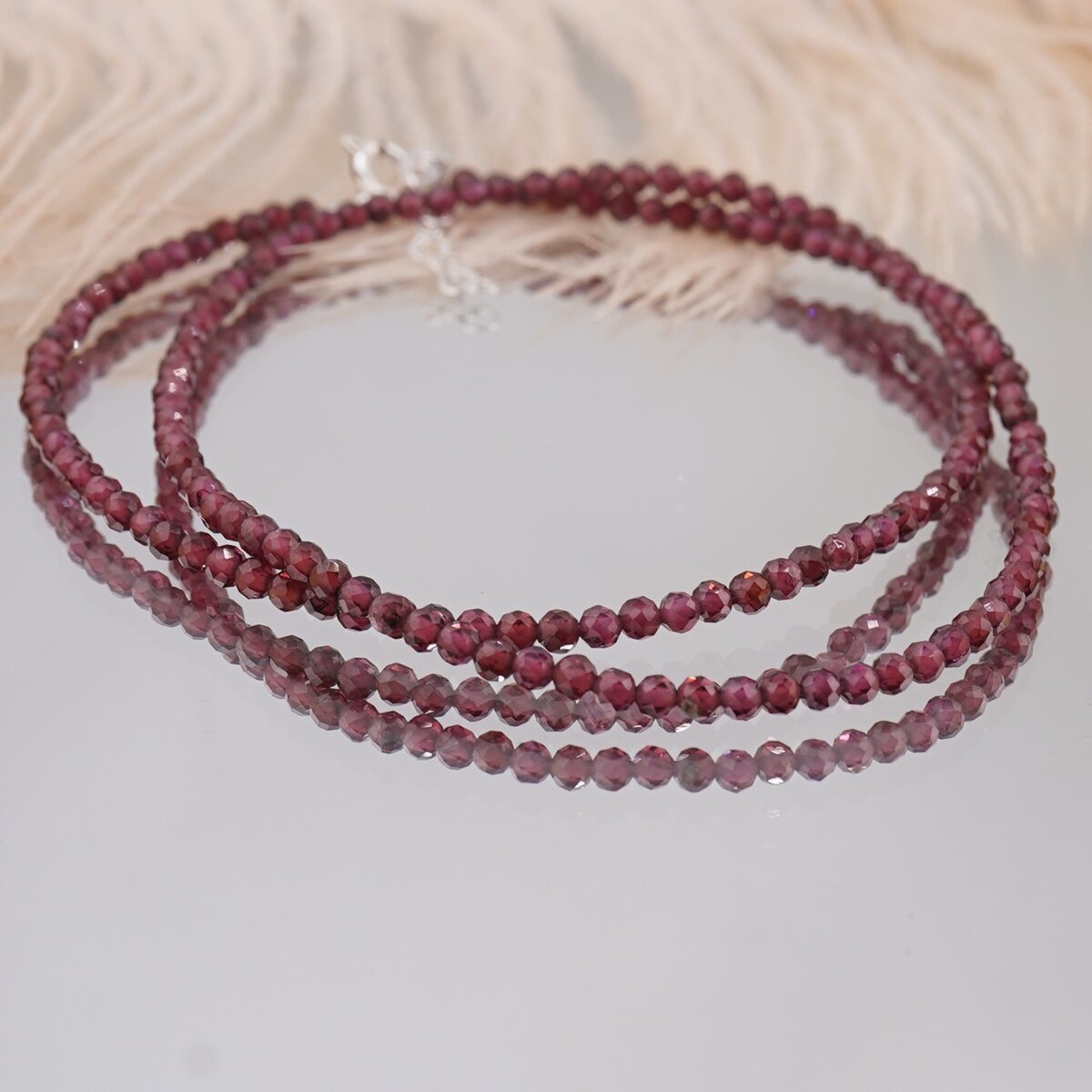 Poartă colierul singur, pentru un accent subtil, sau alătură-l altor piese pentru un mix personal. Profilul delicat de 3 mm și sclipirea fină a sferelor fațetate adaugă textură fără a încărca, iar roșul granat aduce un plus de căldură oricărui stil. Alege-l pentru tine sau oferă-l în dar cu gând bun – este o bijuterie care invită la prezență, curaj și expresivitate.