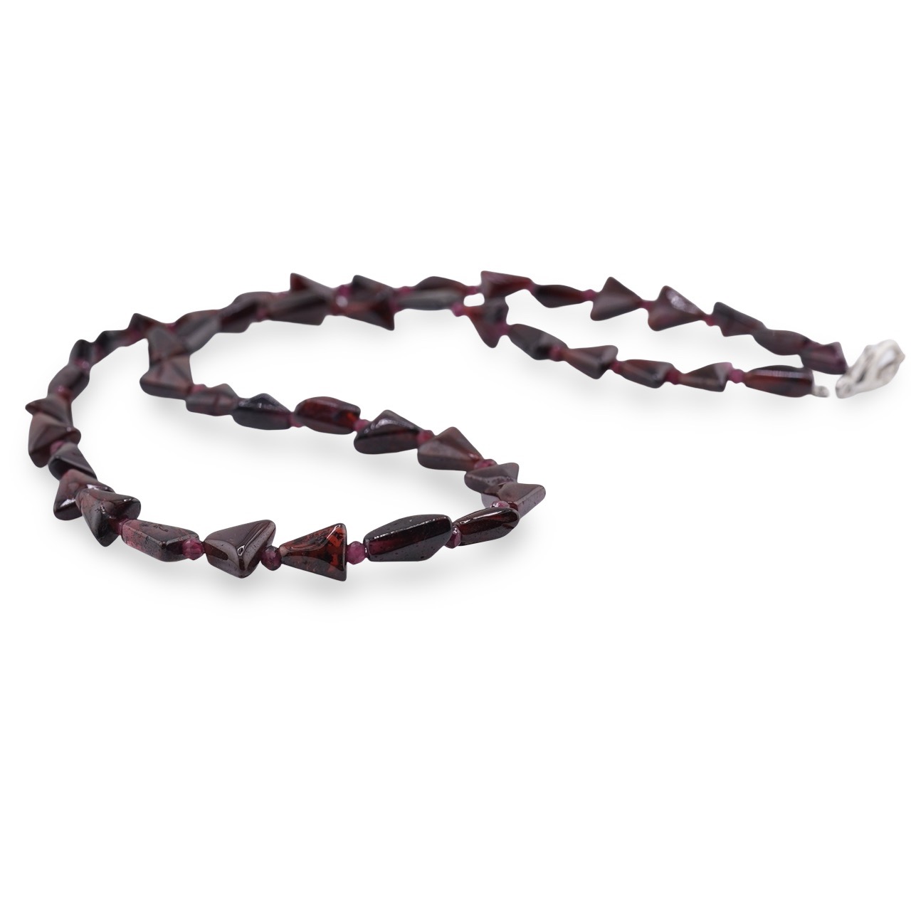 Creat pentru momentele în care ai nevoie de claritate și curaj, acest colier din granat natural îmbină formele geometrice cu rafinamentul finisajului fațetat. Triunghiurile roșii de 6–8 mm alternează cu discuri fațetate de 2 mm, oferind o lumină caldă și constantă la fiecare mișcare. Lungimea de 43 cm îl așază plăcut la baza gâtului, astfel încât să-l porți cu ușurință zi de zi. Granatul, cunoscut și ca Garnet, este un silicat de aluminiu și fier supranumit piatra pasiunii, apreciat pentru culoarea sa roșu intens și pentru aspectul elegant în bijuterii cu cristale naturale.