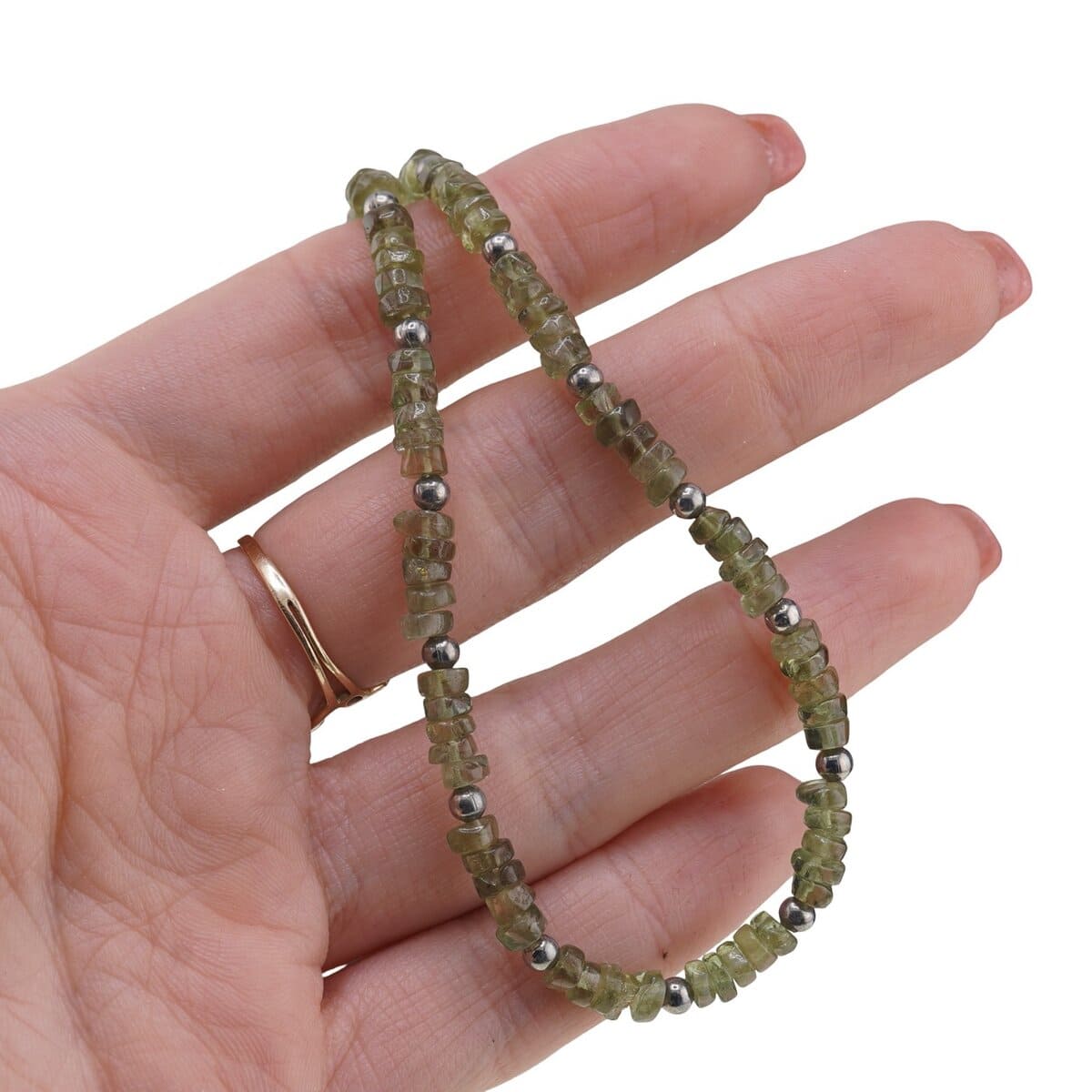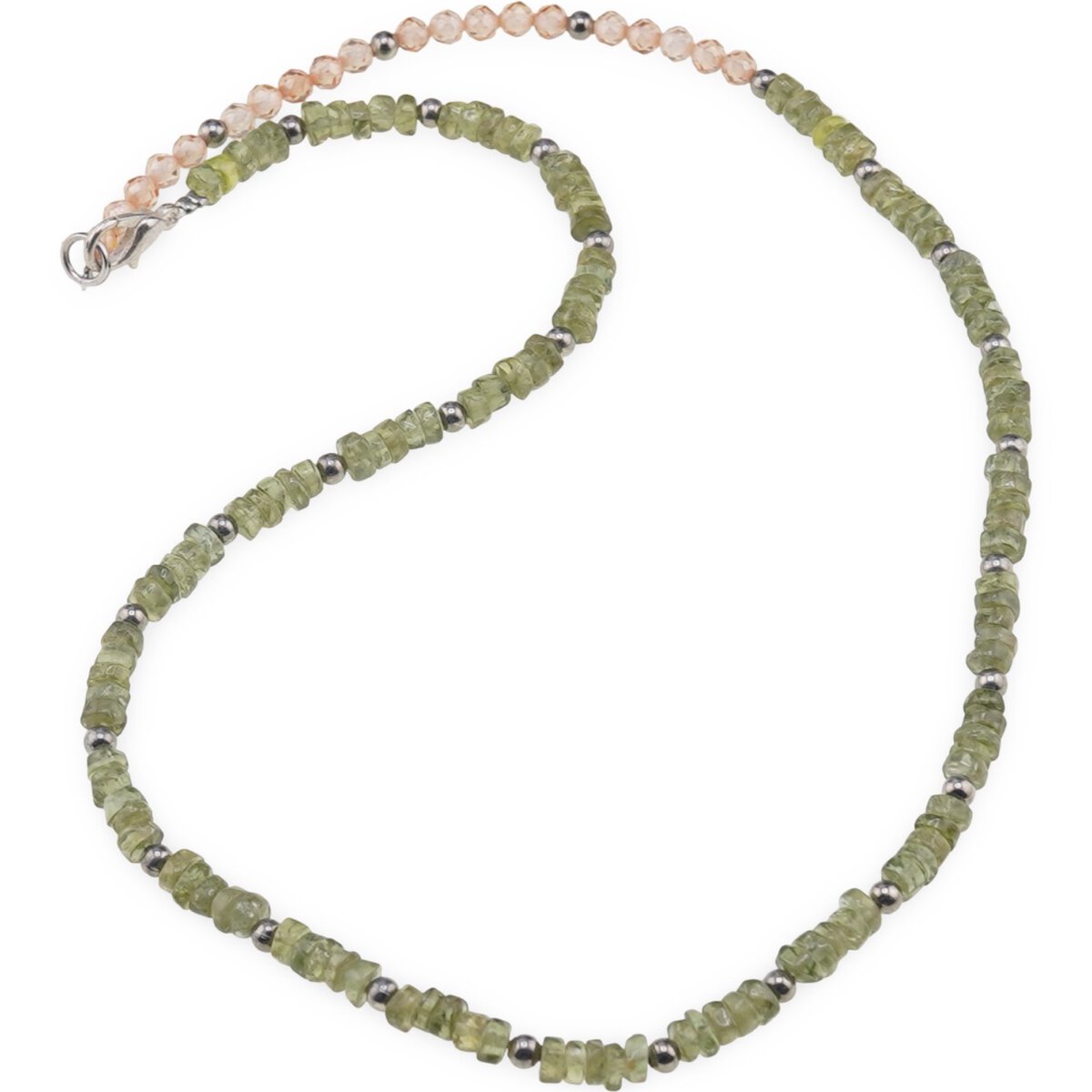 Acest colier din granat verde și zirconiu este gândit pentru tine dacă îți dorești mai multă claritate, energie și stabilitate emoțională în viața de zi cu zi. Rondelele de granat verde de 4 mm se împletesc armonios cu sferele fațetate de zirconiu portocaliu, iar bumbiile argintii adaugă o notă discretă de eleganță, rezultând un accesoriu ușor de purtat atât la birou, cât și în momentele tale de relaxare.