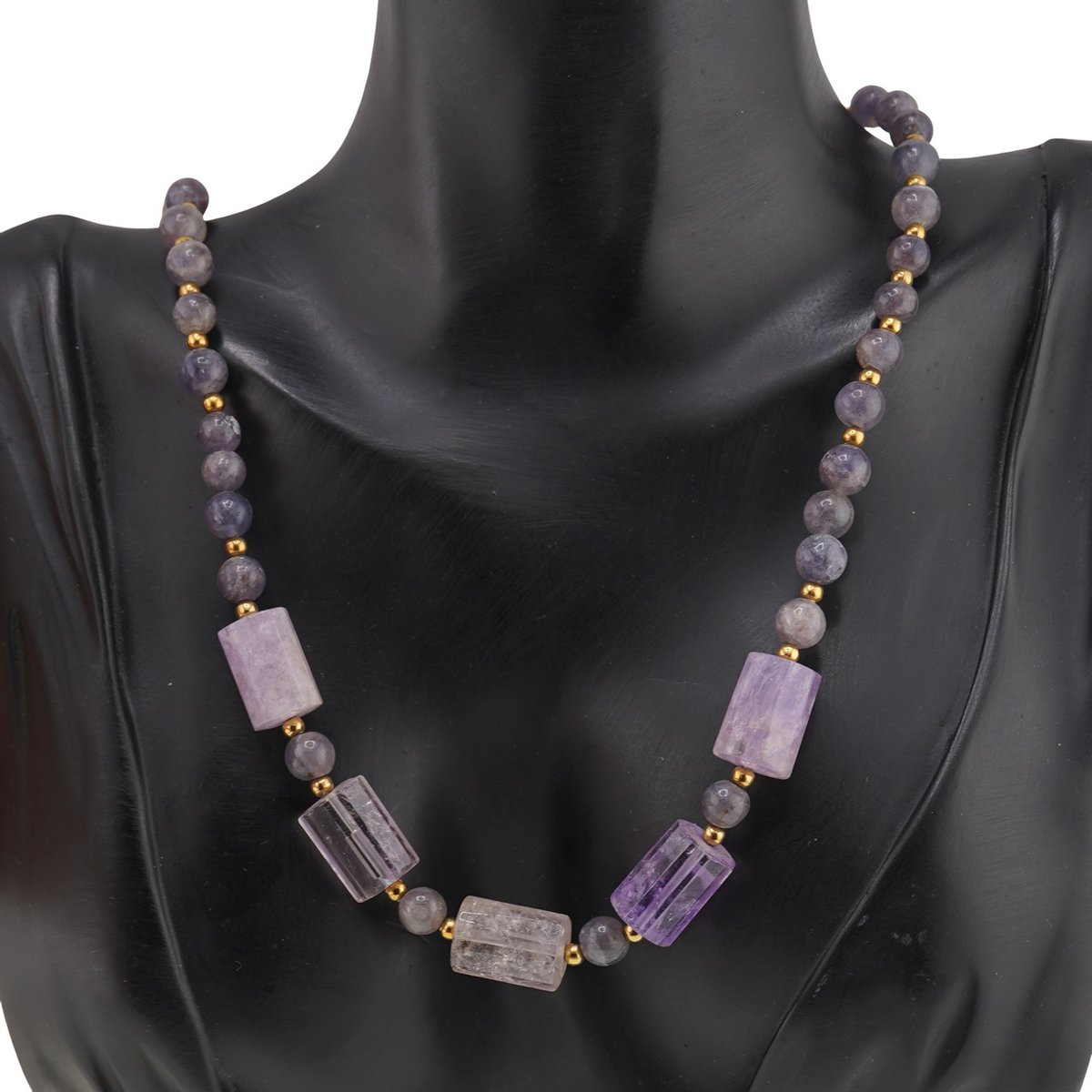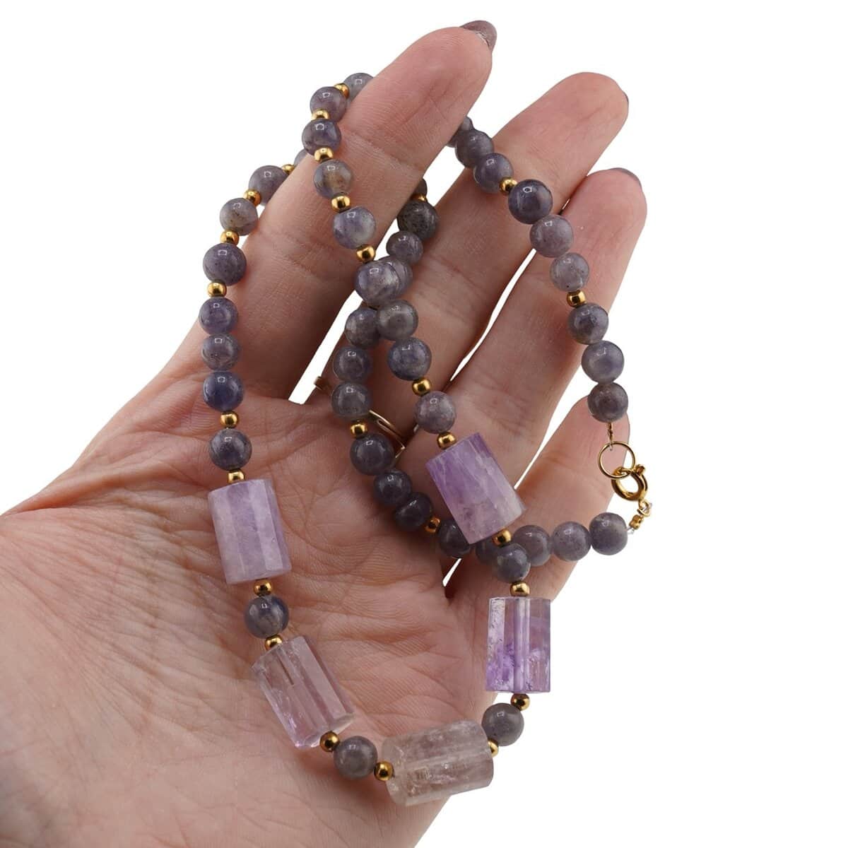 Creat pentru a te însoți cu discreție și rafinament, acest colier din ametist natural 100% îmbină nuanțele de mov ale cuartului violet cu sclipirile calde ale elementelor aurii. Alternanța dintre biluțele de 6 mm și tuburile fațetate de 14 mm oferă un joc plăcut de texturi, iar lungimea de 43 cm se așază confortabil la baza gâtului. Cunoscut și ca Amethyst, „piatra înțelepciunii”, acest cristal aduce o notă elegantă oricărei ținute de zi sau de seară.