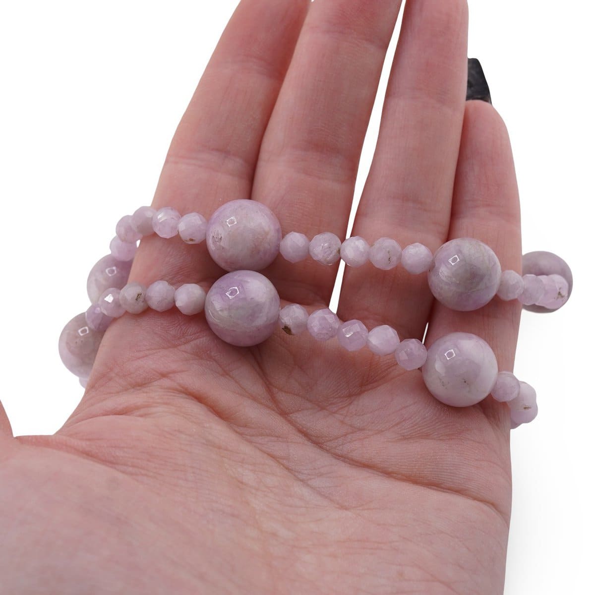 Acest colier din cristal natural 100% te întâmpină cu o nuanță de roz diafan și cu un joc delicat de lumină, creat de alternanța dintre sferele netede și cele fațetate. Realizat din Kunzit (cunoscut și ca Kunzite), varietate roz de spodumen, colierul aduce în prim-plan rafinamentul discret al pietrelor semiprețioase, într-o bijuterie plăcută de purtat zi de zi.