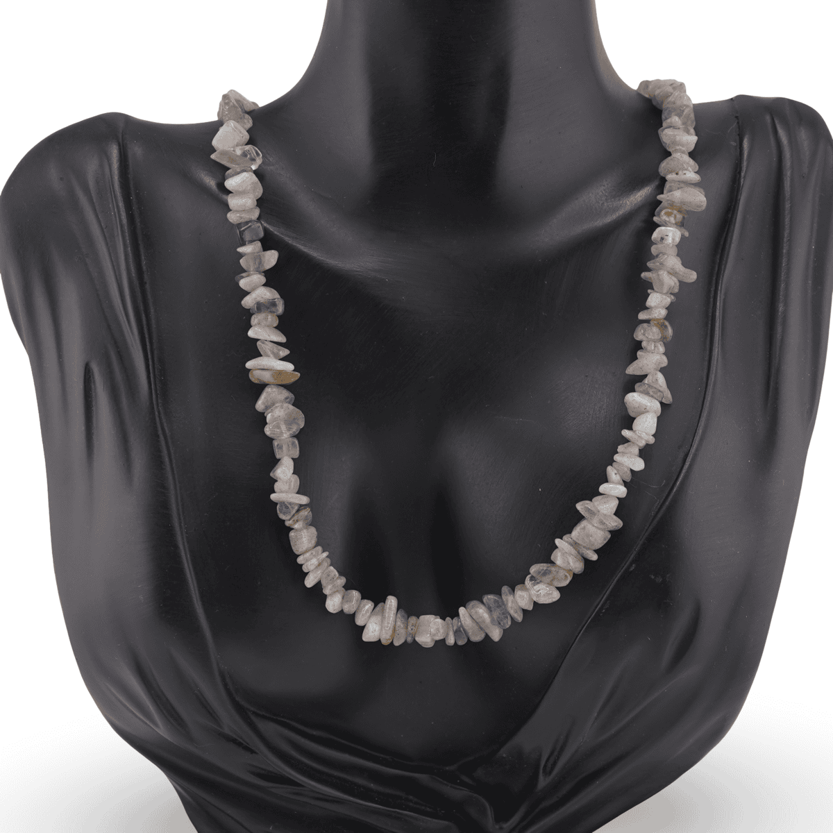 Acest colier este alcătuit din bucăți de labradorit în formă de chips, atent alăturate de-a lungul unei lungimi de aproximativ 43 cm, astfel încât să se așeze confortabil la baza gâtului. Duritatea de 6–6,5 pe scara Mohs face ca piatra să fie suficient de rezistentă pentru purtare frecventă, păstrând totodată aspectul natural al cristalelor semiprețioase.