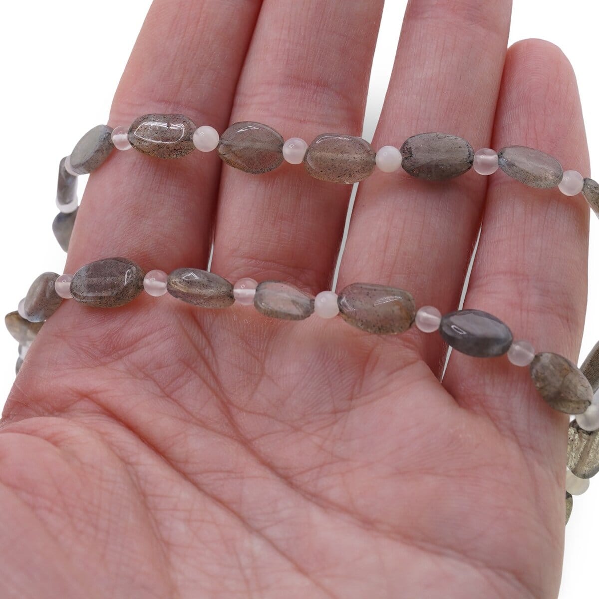 Un colier din cristale naturale 100%, creat pentru tine dacă ești atras de nuanțele calme de gri și alb și de energia subtilă a pietrelor semiprețioase. Labradoritul cu reflexe gri sidefii este tăiat în briolete și discuri fațetate între aproximativ 8 și 11 mm, iar Piatra Lunii aduce accente alb-lăptoase prin sfere fine de 3 mm. La 43 cm lungime, se așază elegant aproape de baza gâtului și se integrează ușor atât în ținutele de zi, cât și în cele de seară.